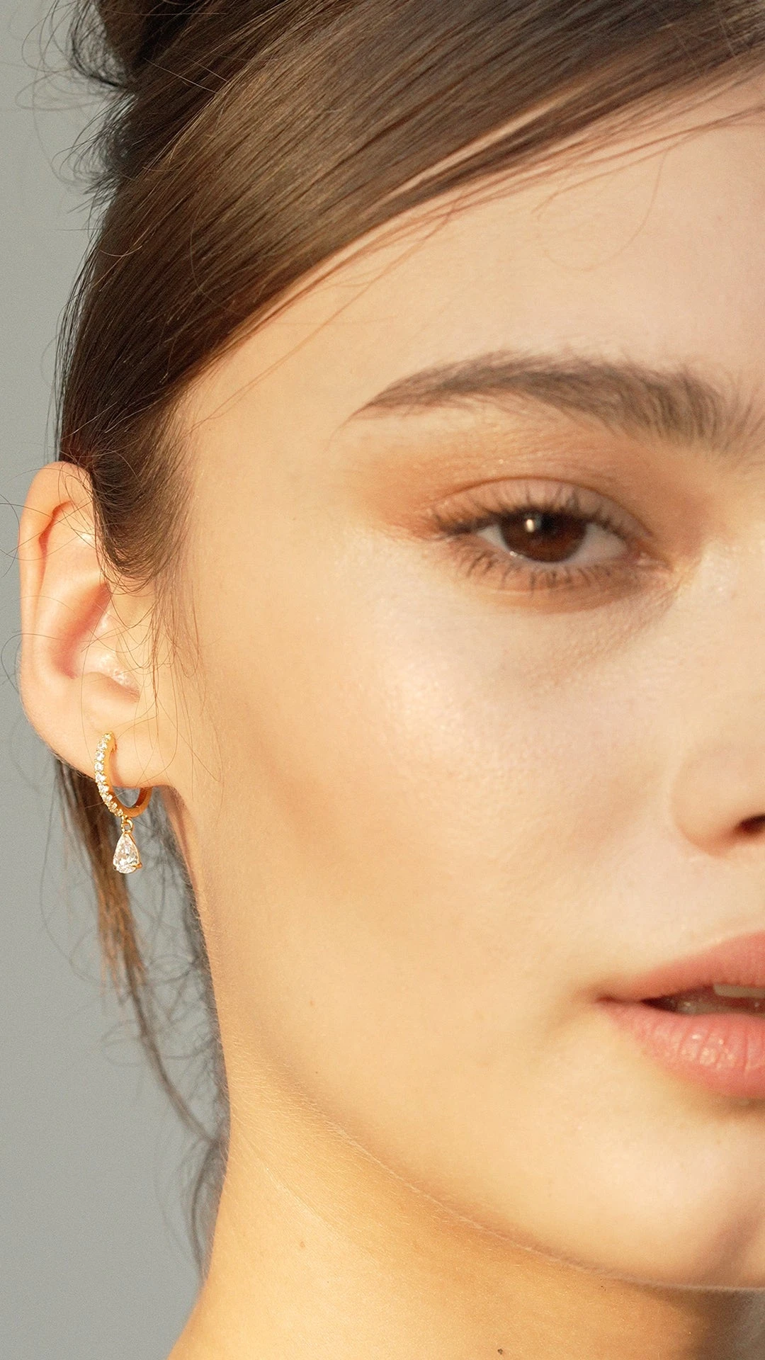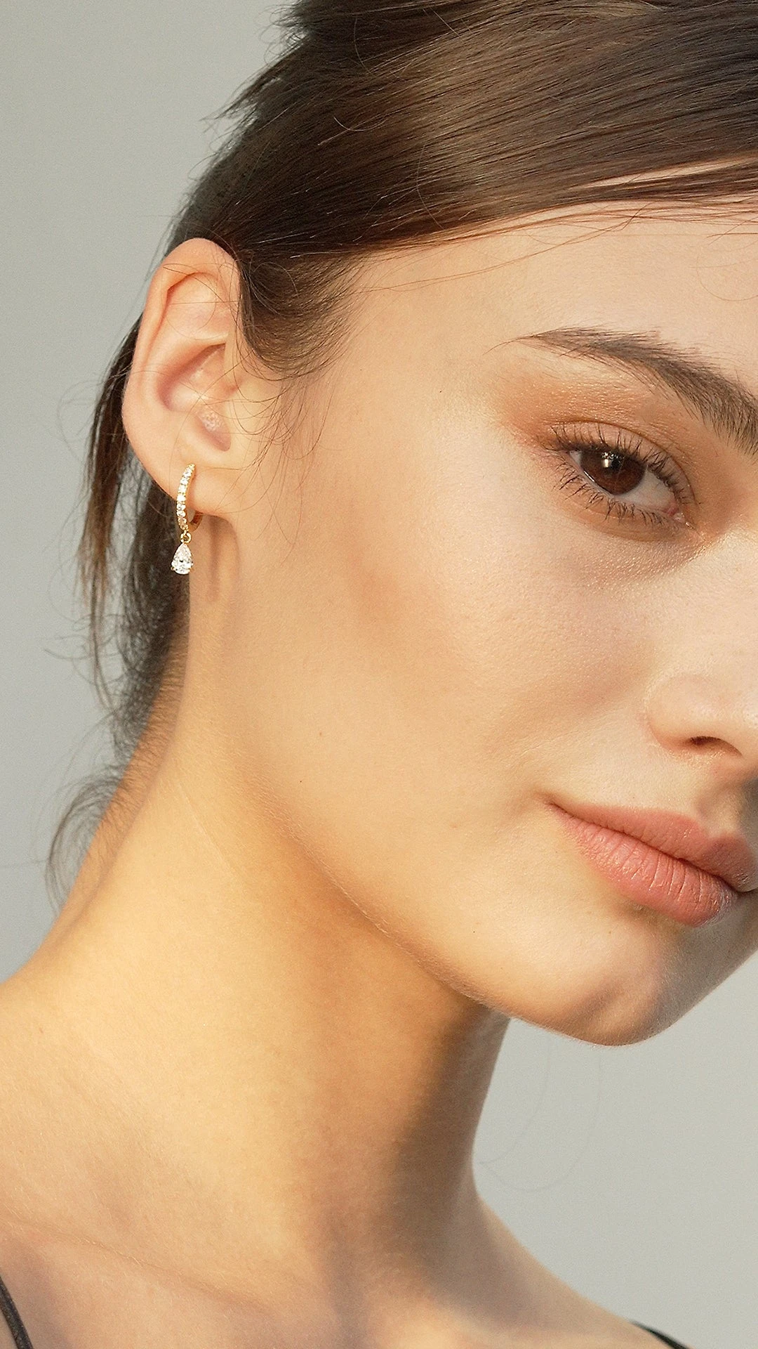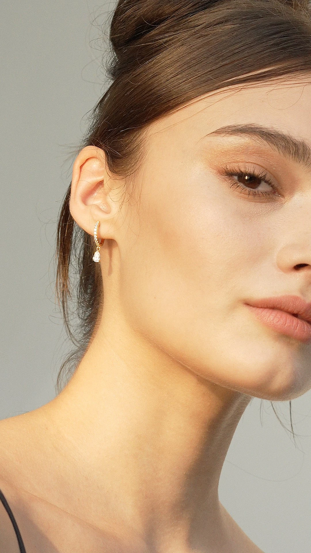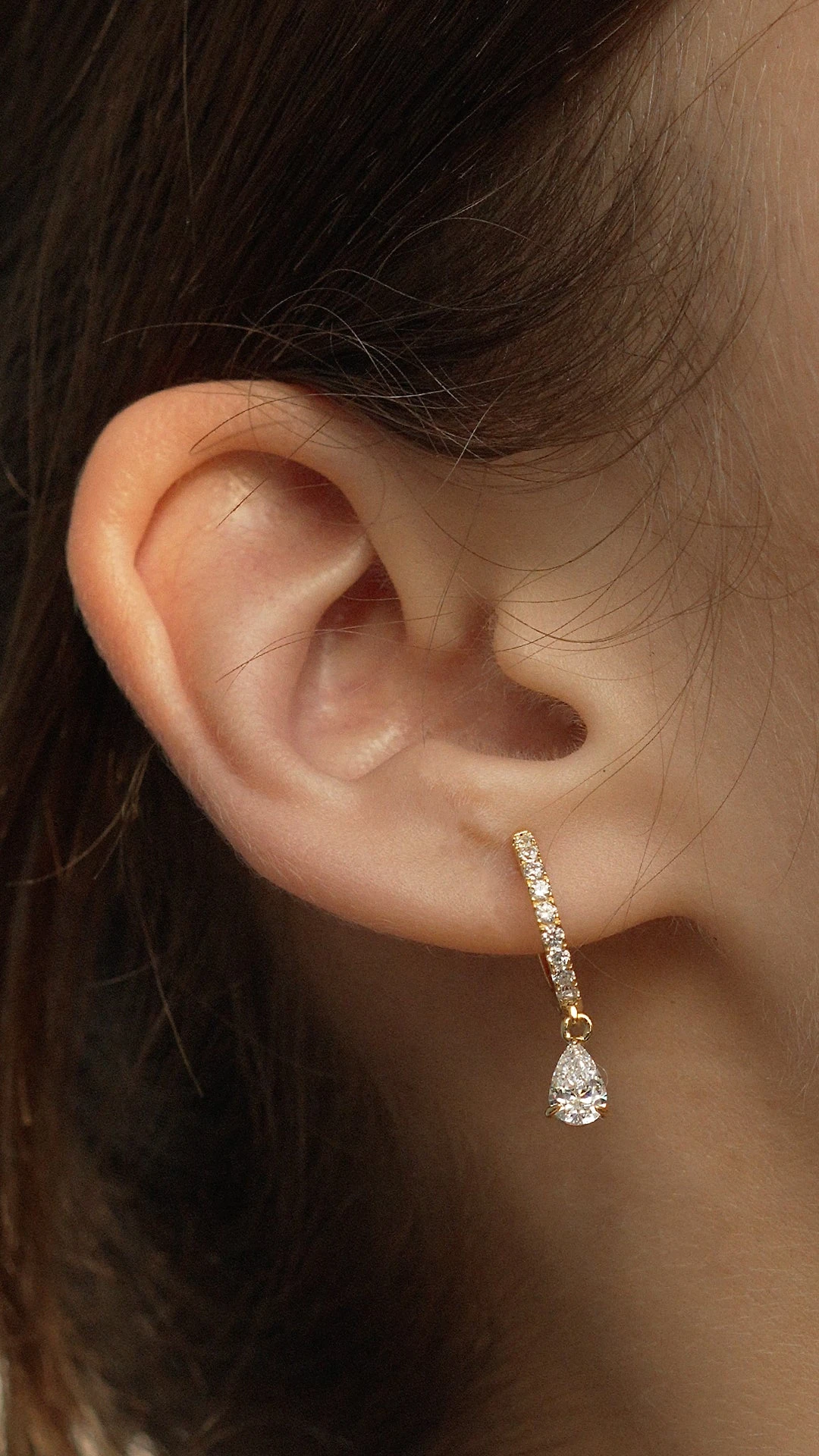 The Leni Hoops are lined with a detailed round micro setting and are finished with a hand-cut pear drop in brilliant white. Easy to wear from day to night.