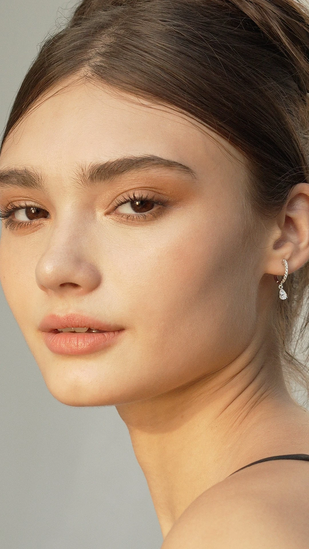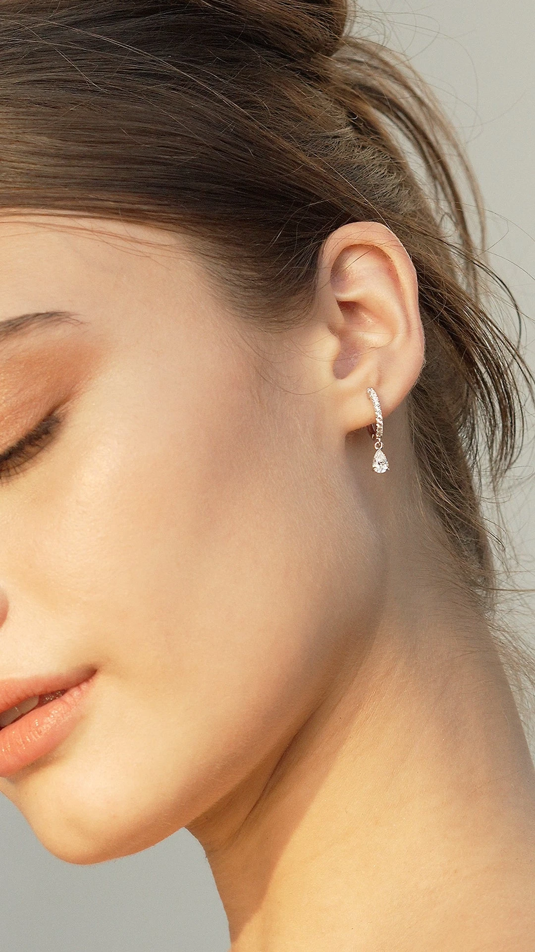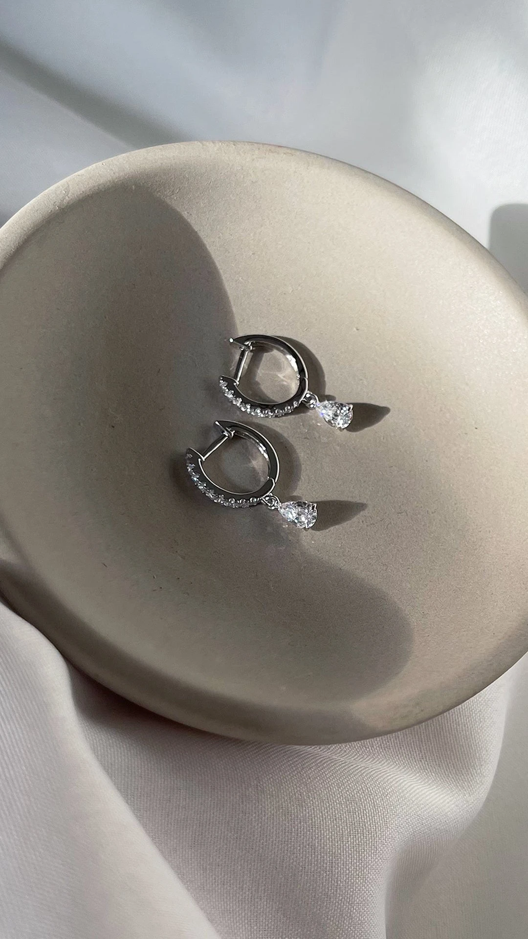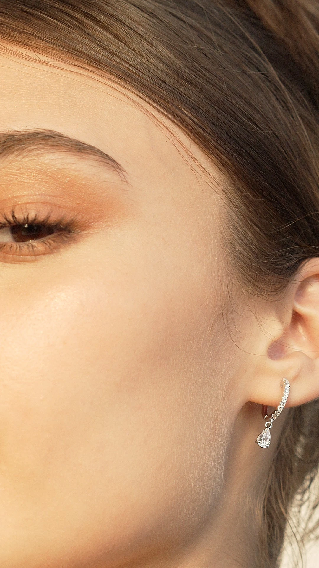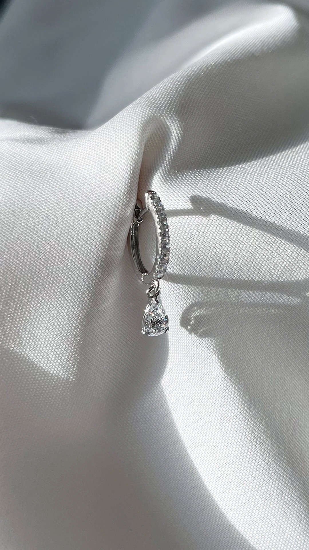 The Leni Hoops are lined with detailed micro settings and finished with a hand-cut pear stone in brilliant white. Easy to wear from day to night.