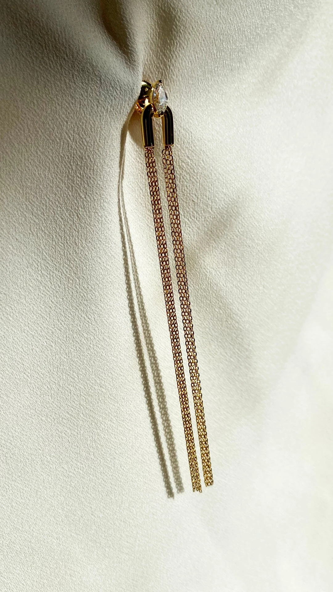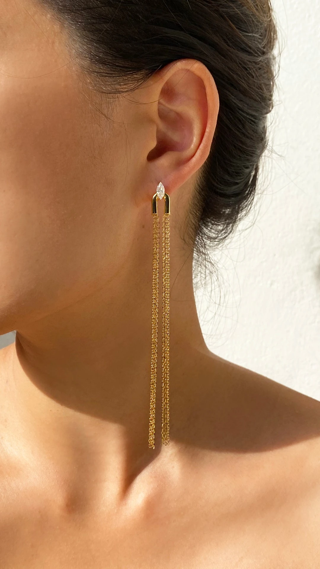 Get ready to be asked where you got this piece. Delicate long chains hang from polished metal finished with a single sparkling Marquise stone. Wear as an edgy asymmetrical single earring, or purchase two to wear as a pair.