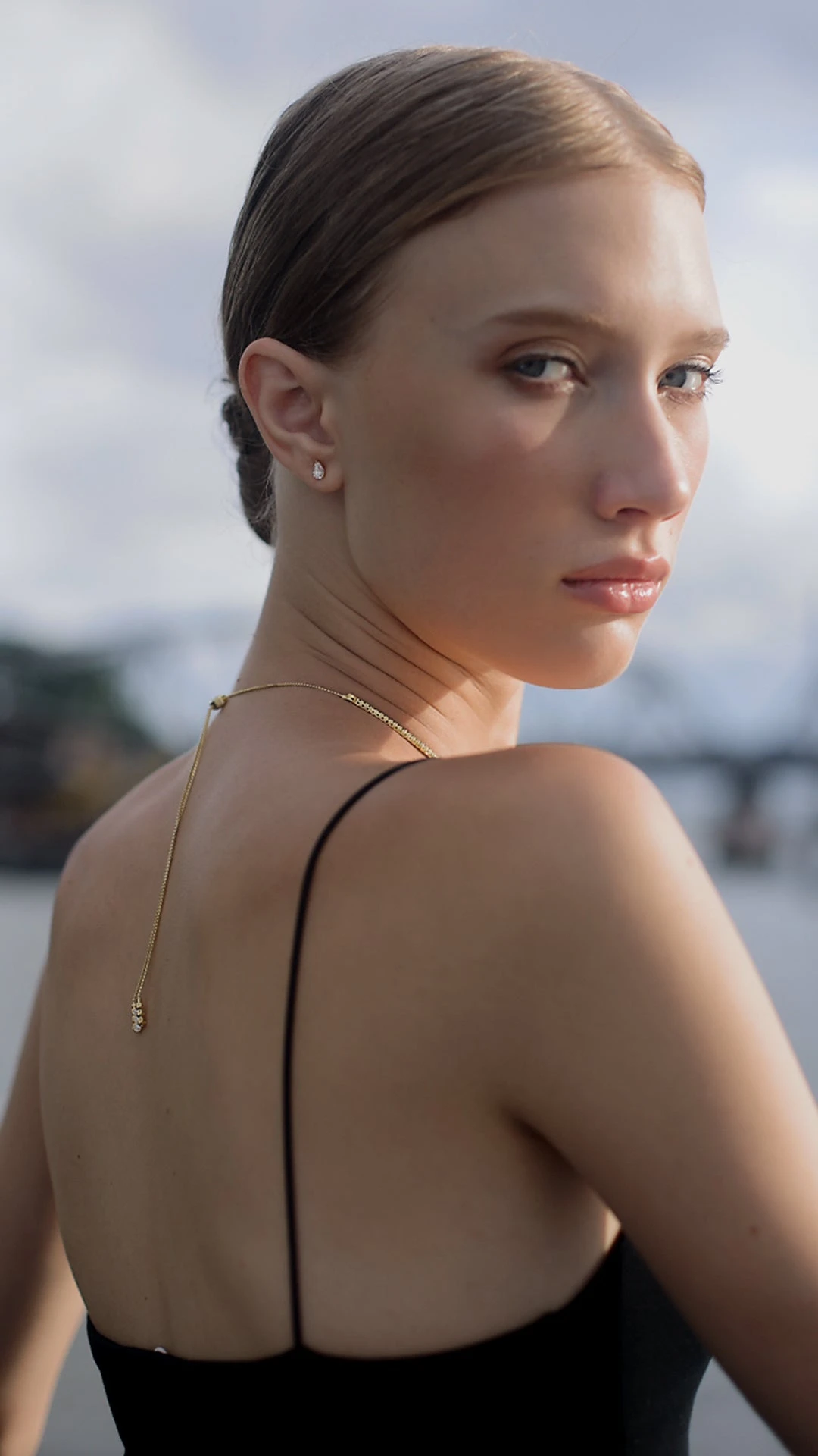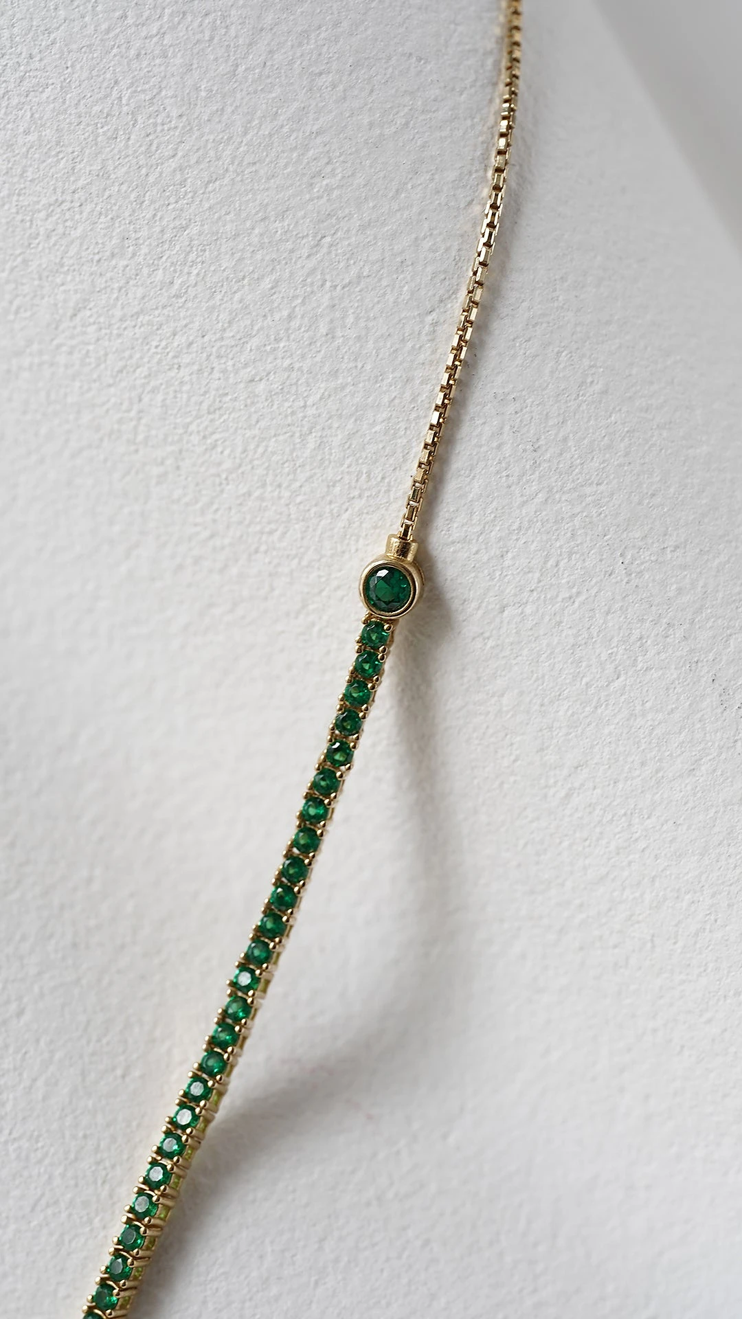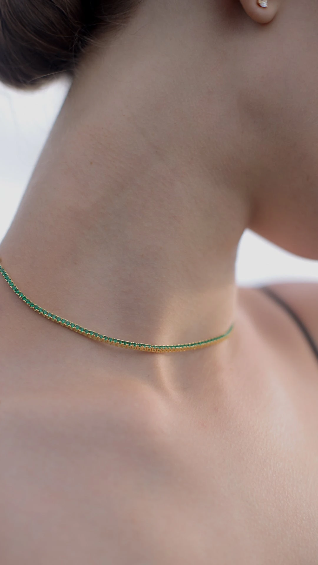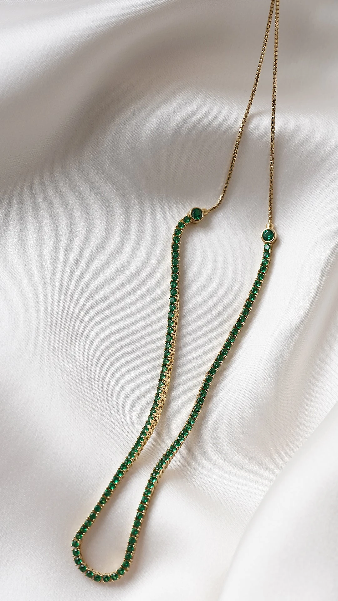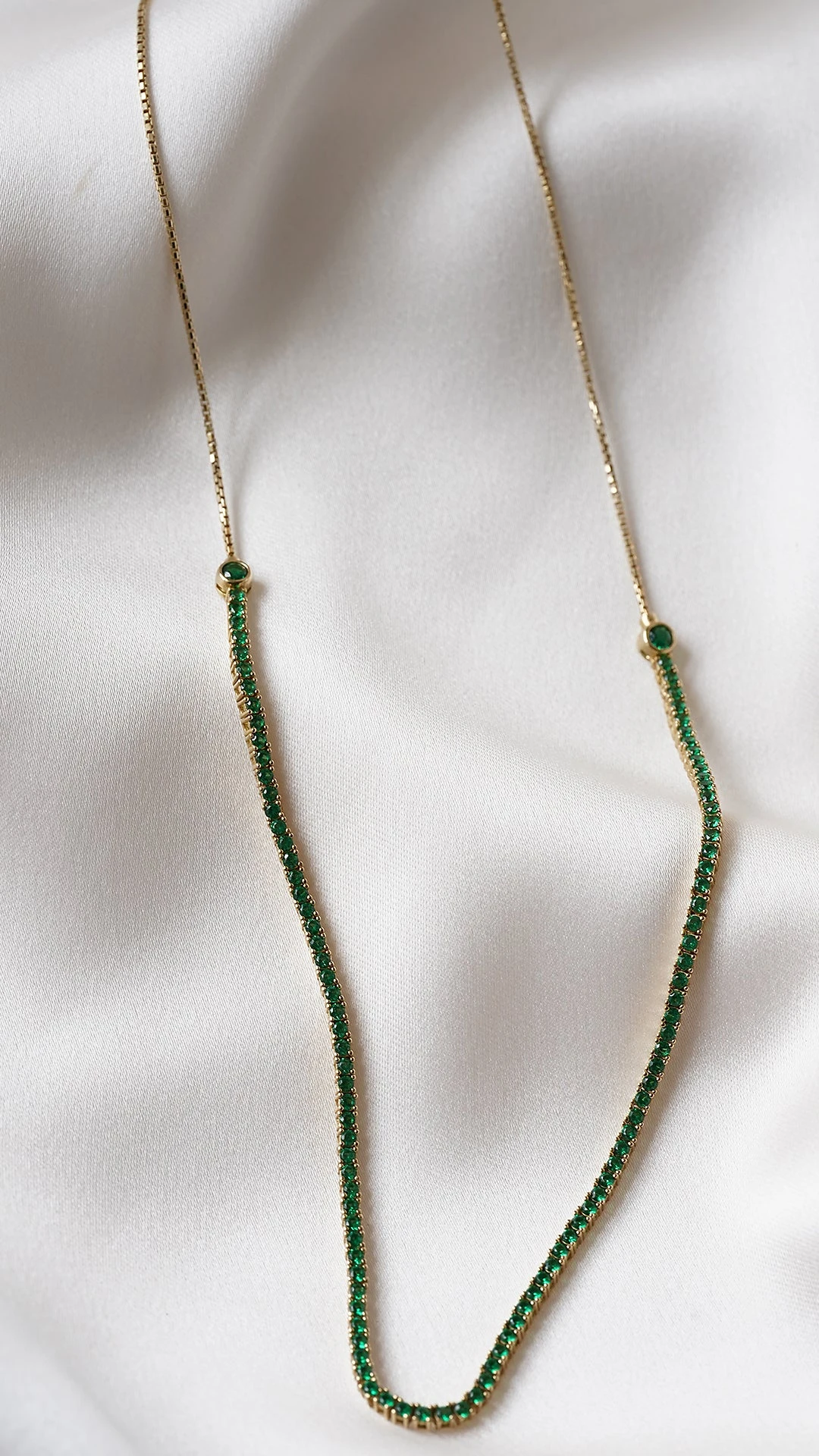 This piece is inspired by a clean and minimal tennis design. It can be worn as a choker, loose, lariat, or flip around as a pendant necklace. It is handcrafted in Sterling Silver in a yellow fold finish.