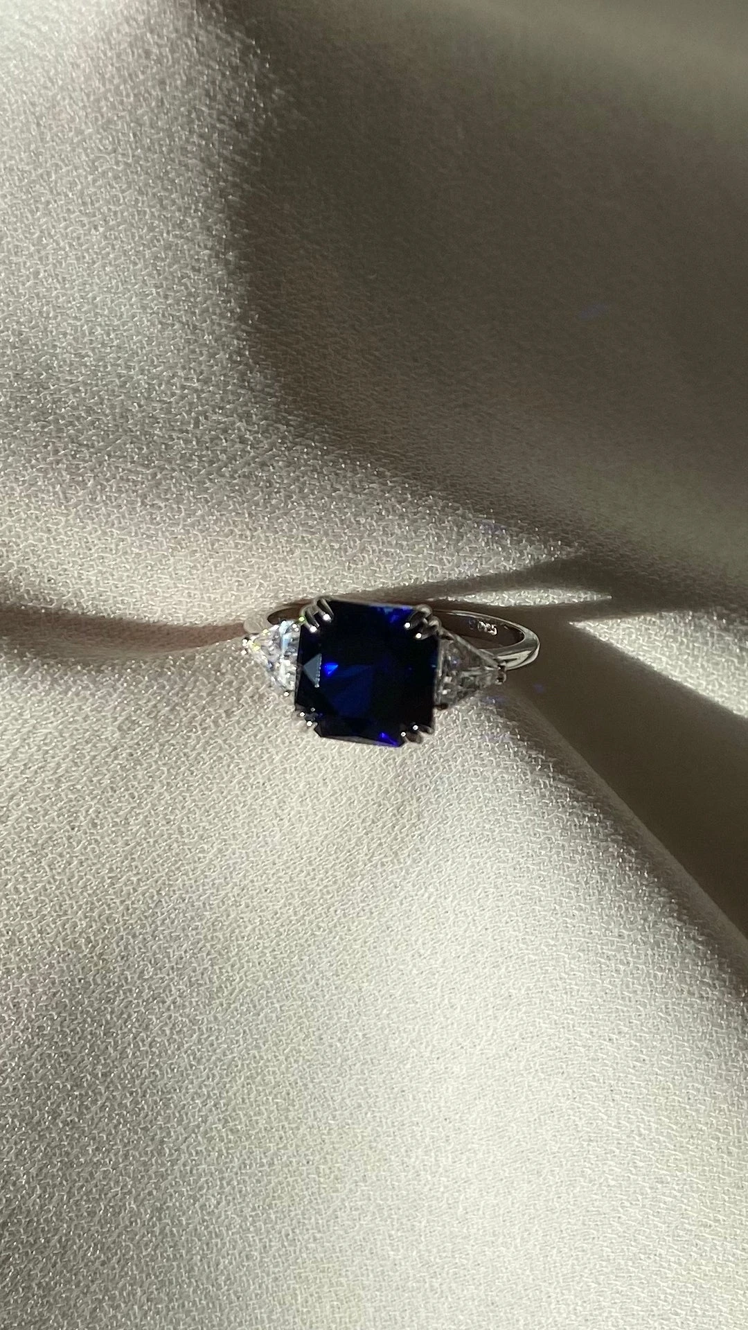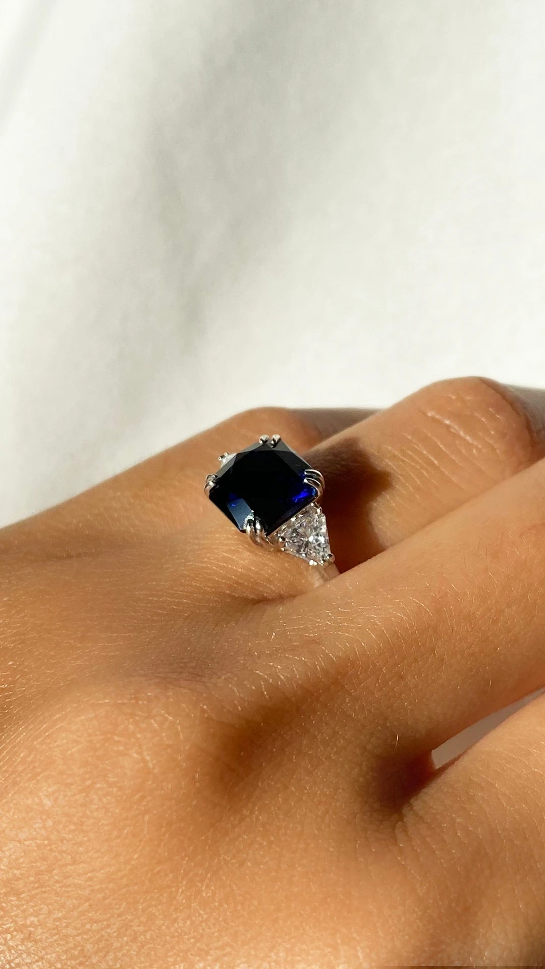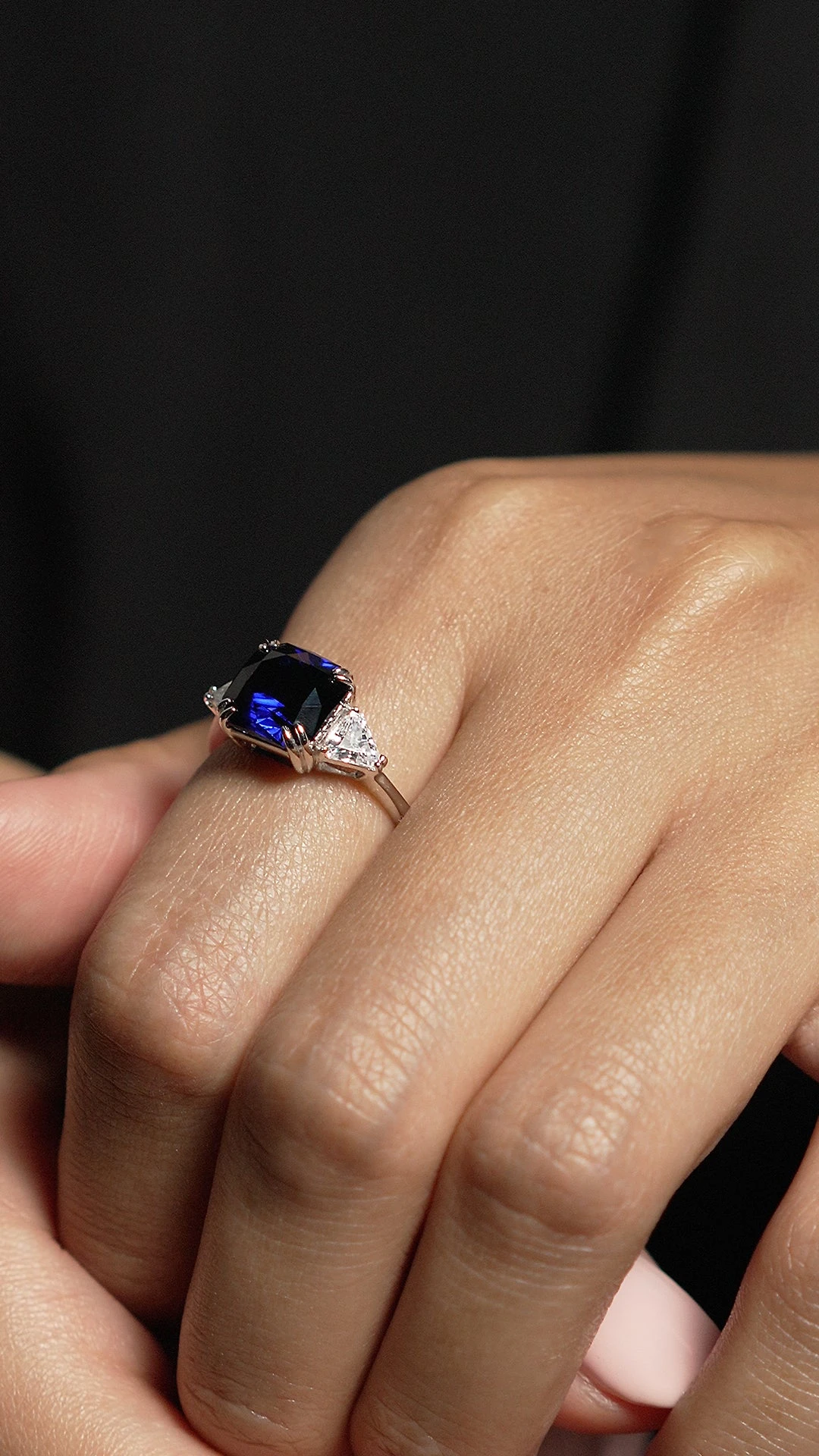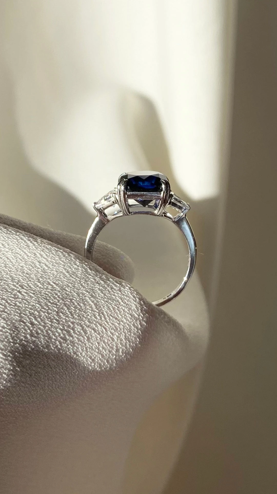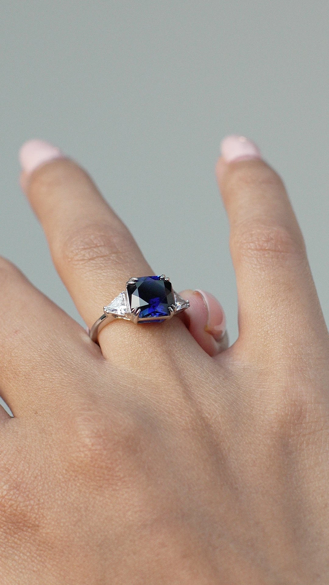 This stunning sapphire Flanders cut trilogy ring is a playful juxtaposition of time-honoured techniques with utterly modern sensibilities. Its cut is another example of a modified Round Brilliant and, as a result, is comparable, if not superior, to the best Rounds or Princess cuts.