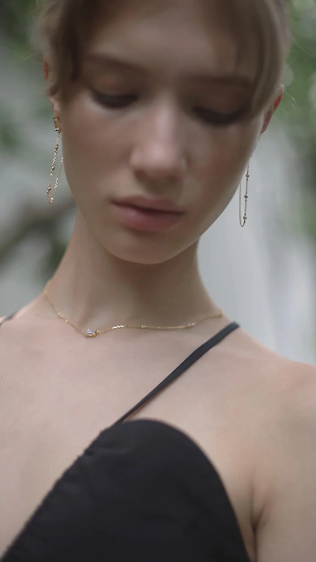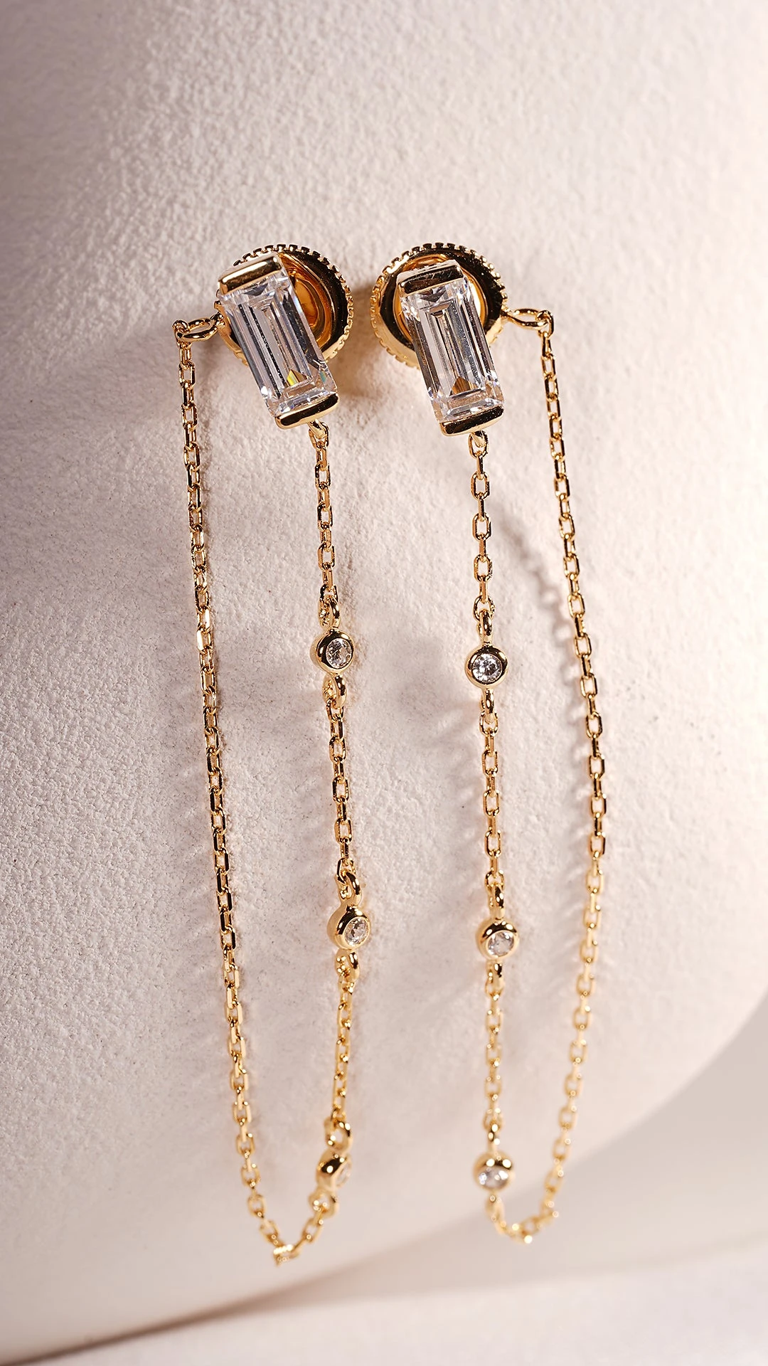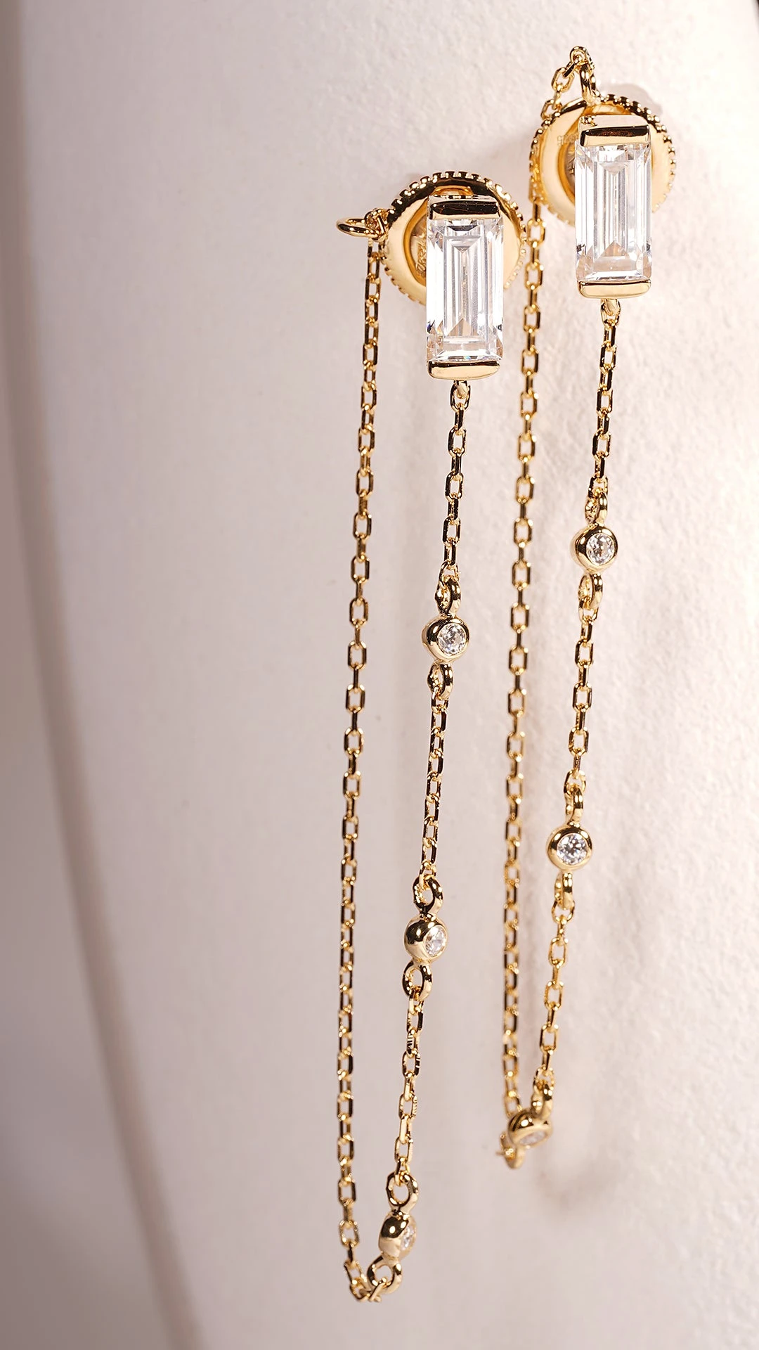 A pair of earrings ready to take you from day to night. Featuring a single baguette cut stone in a bezel setting with a delicate chain detail. Enhance your daily rotation with a hint of yellow gold.