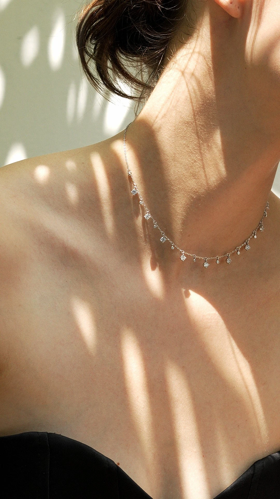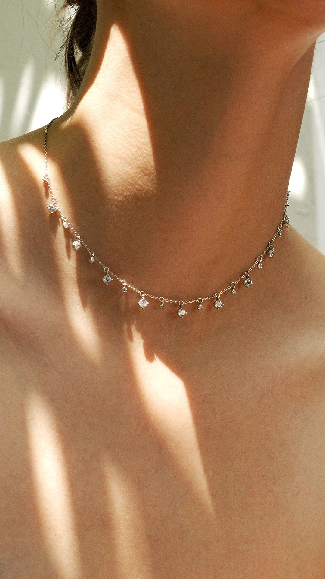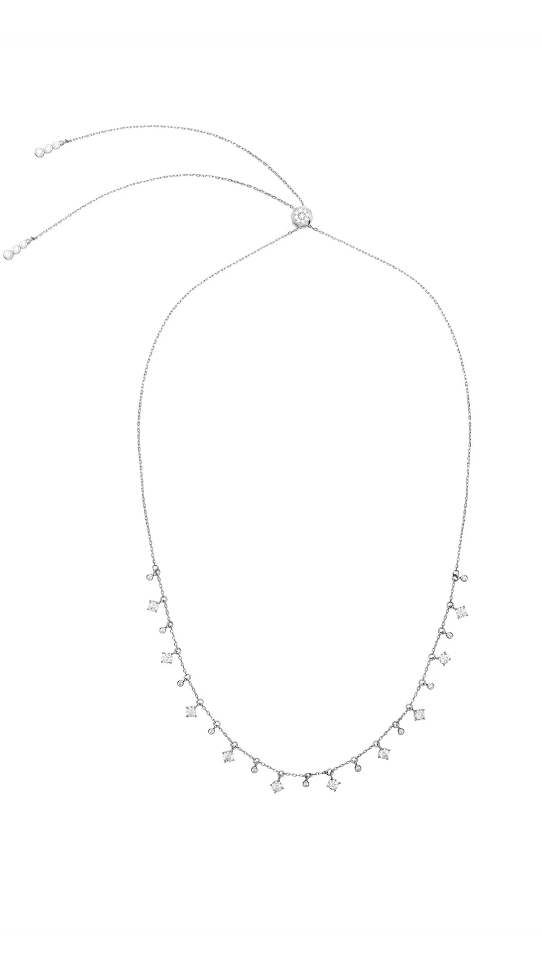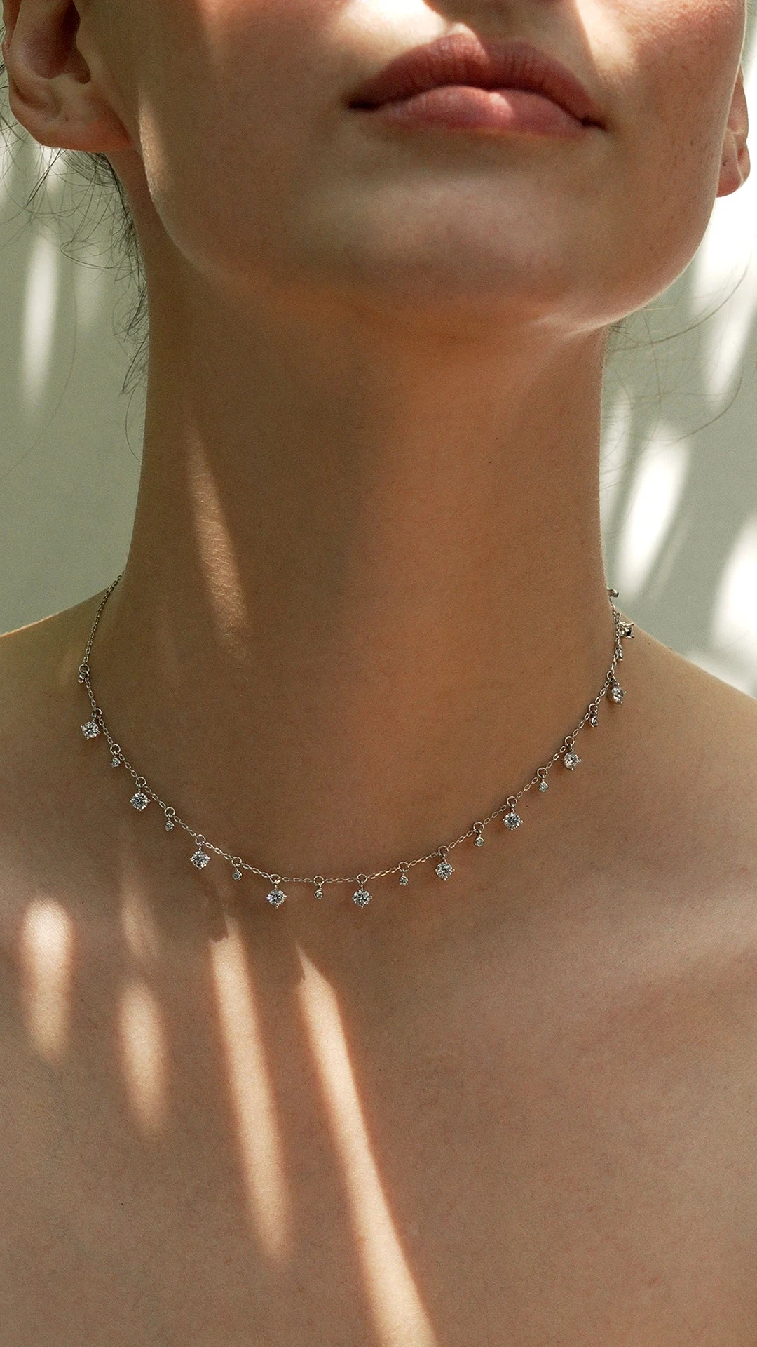 A stunning delicate necklace comprised of alternating sizes of round brilliant stones. Wear above the collarbones in a choker style. Complete with a slider closure for a fully adjustable fit.