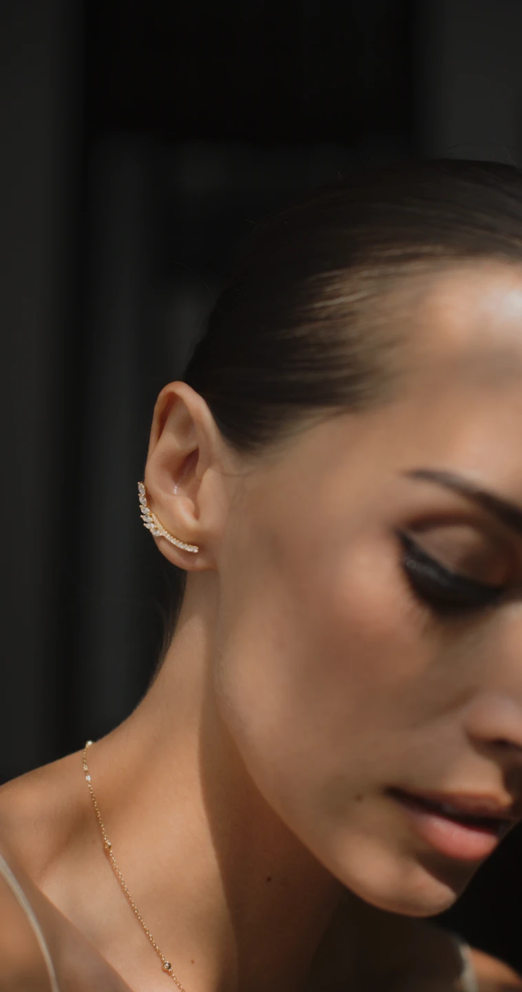 This earring is designed with a rear support wire that follows the curve of your ear. Handcrafted in Sterling Silver in Yellow Gold Vermeil, it features Marquise stones.