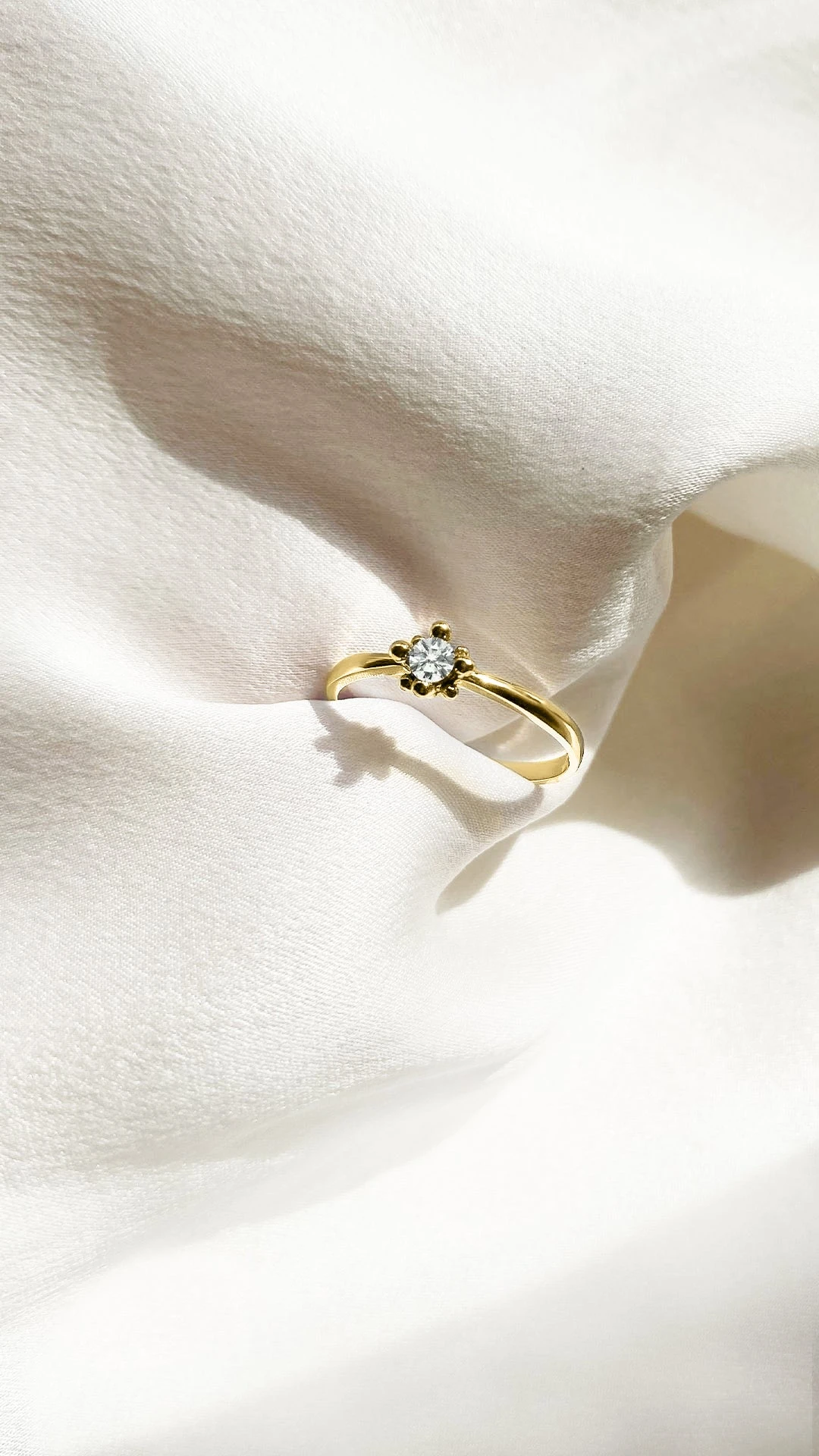 A glittering round diamond sparkles on a delicate tapered band. An asymmetrical 8- prong setting adds a beautiful organic touch. We love this ring all on its own or layered with other rings from the Gentle Diamonds range.