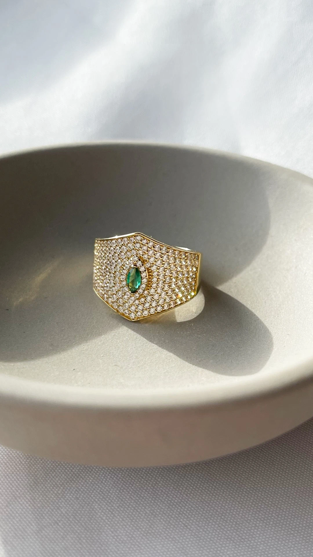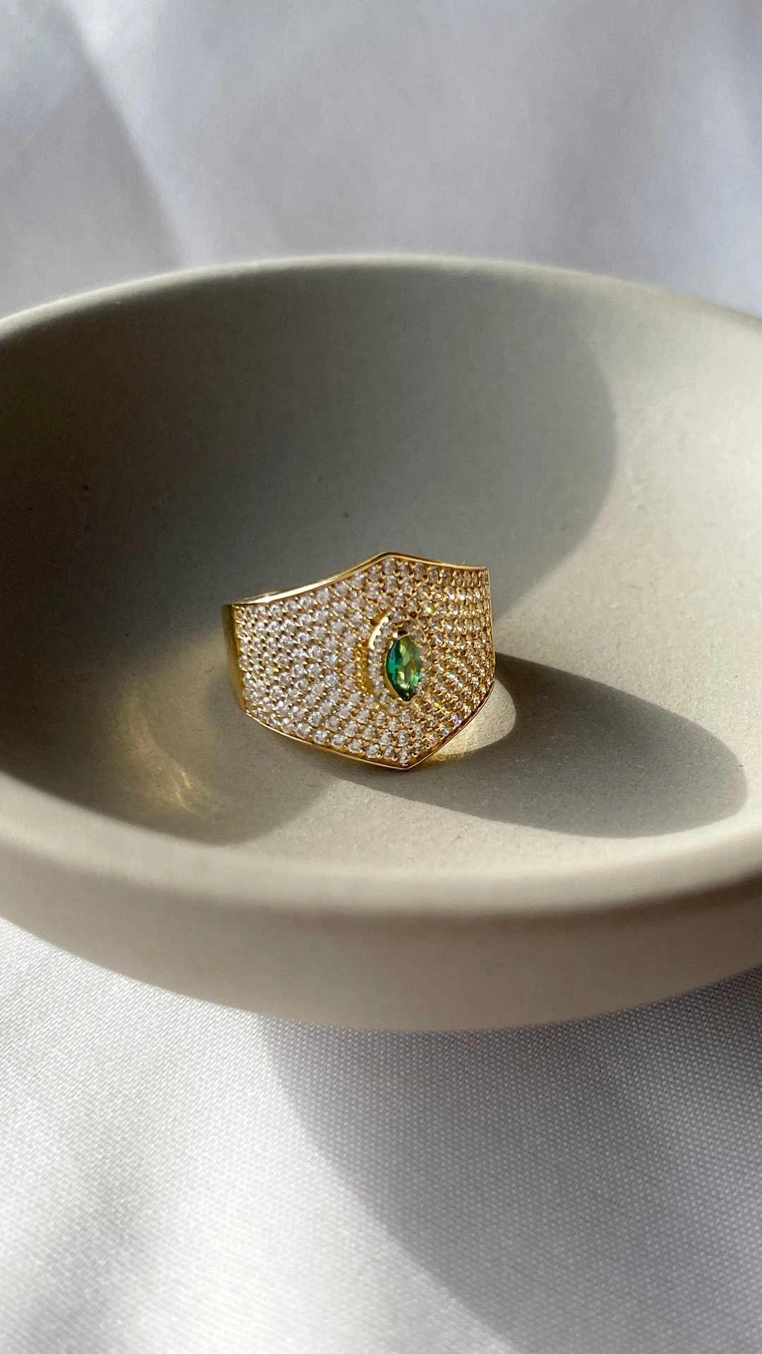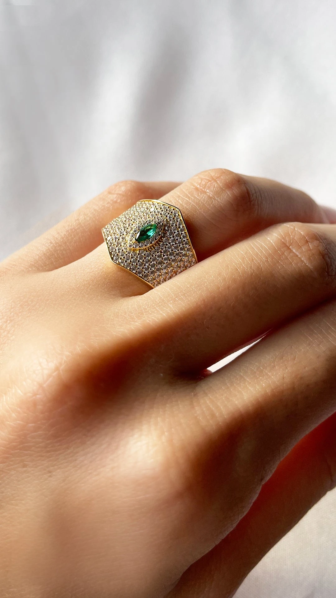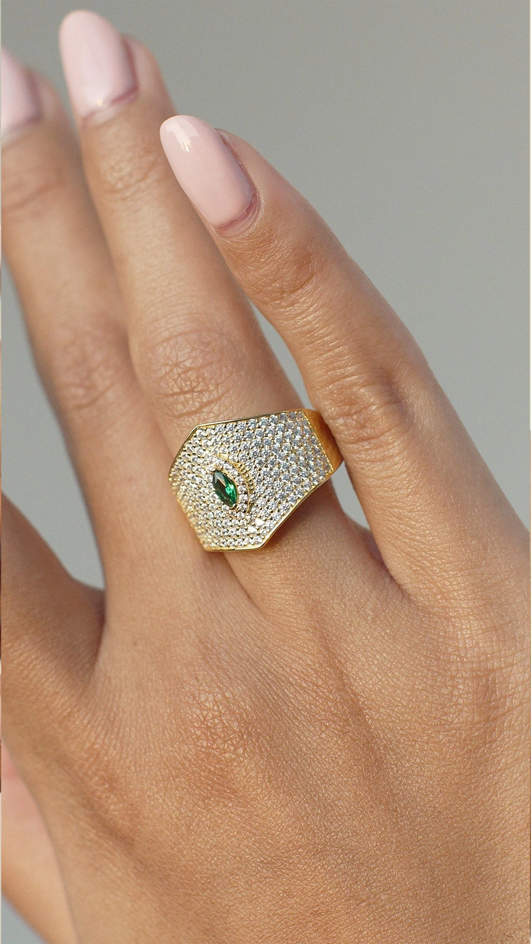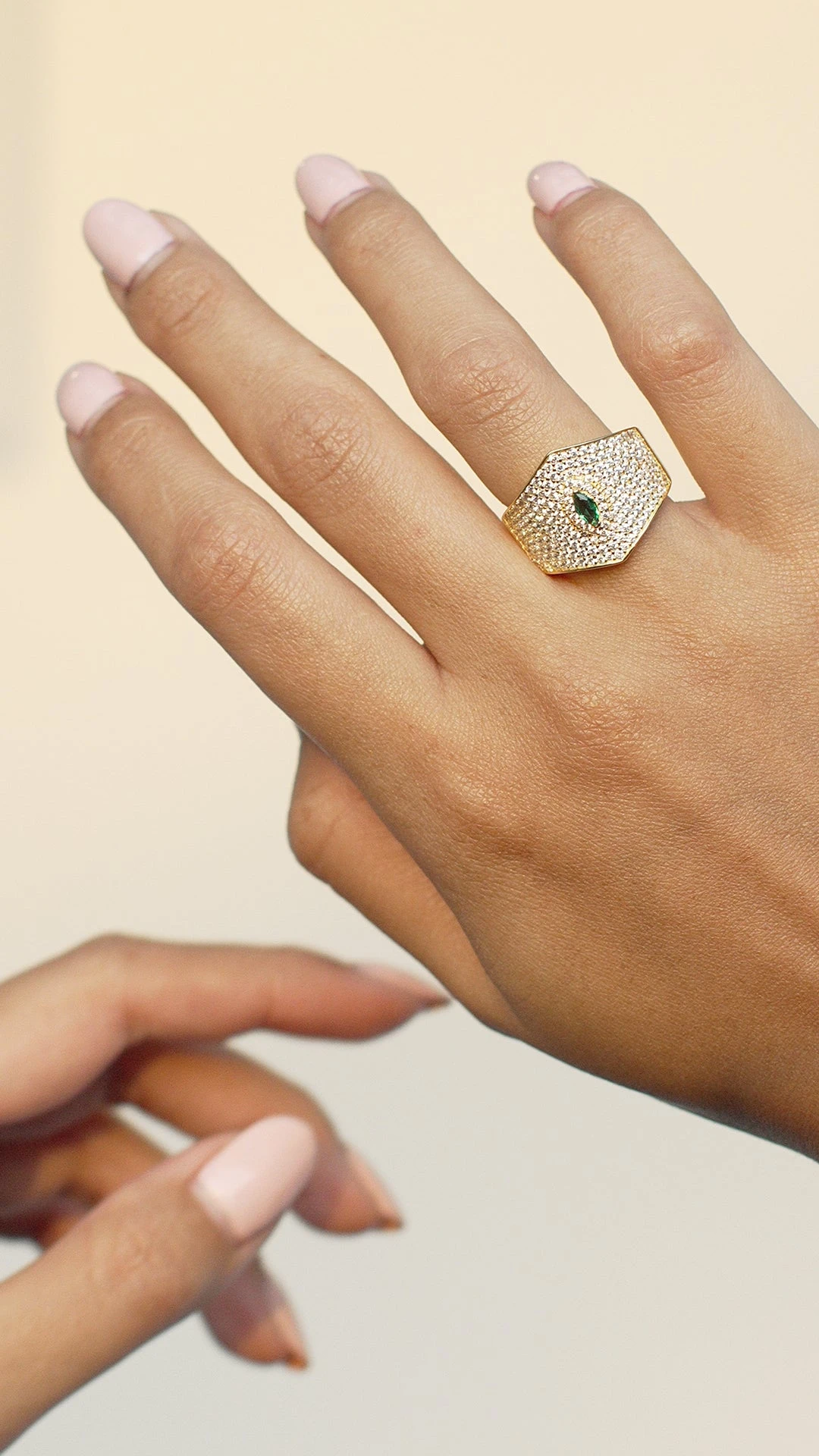 The Makeda ring features a detailed micro pave’ and a delicate Marquis keystone. Day or night versatility makes this ring a go-to for drama in your accessories.