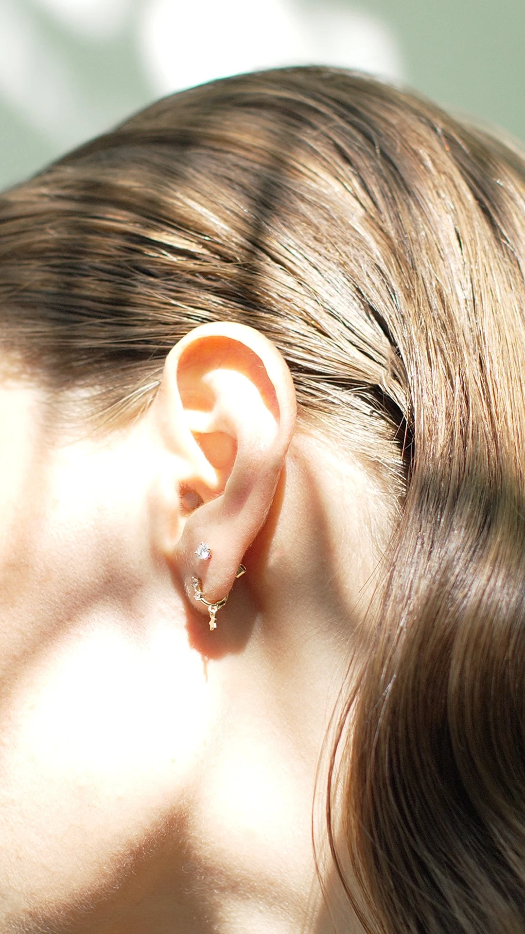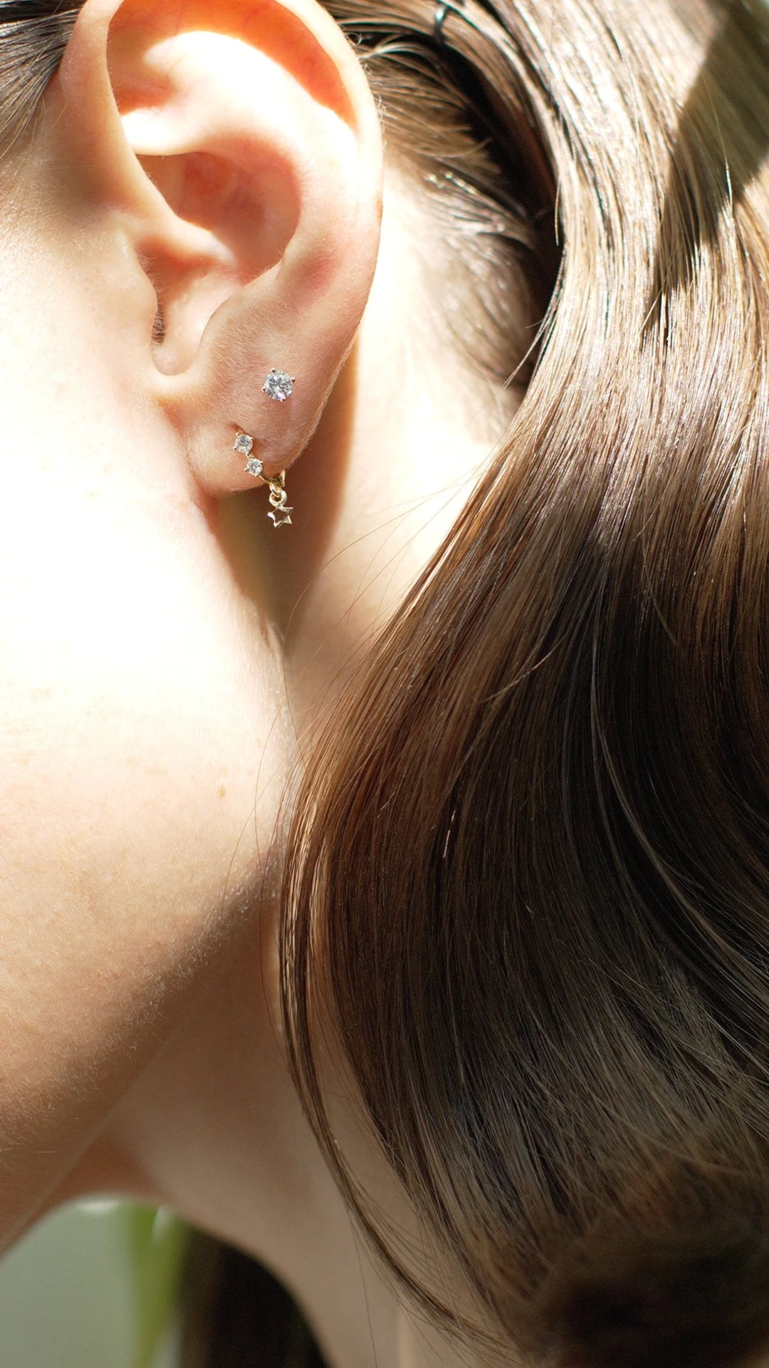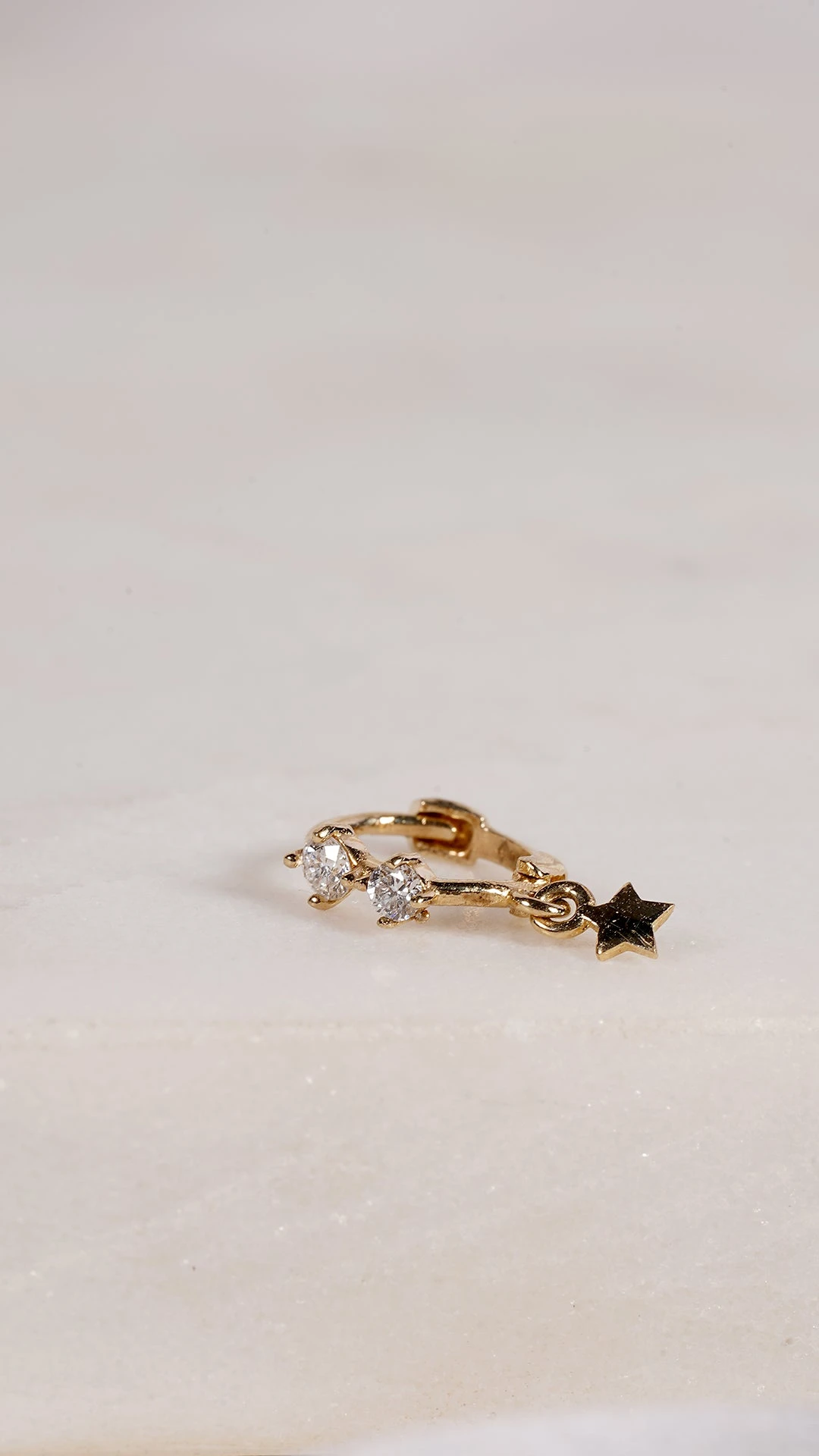 Good things come in tiny packages. A miniature sized hoop earring crafted in solid 9K yellow gold. A mini star dangles from a dainty hoop dotted with round brilliant stones. Best worn on a second or third lobe piercing, pair with tiny studs or a threader for a personalised touch. Approximately 8mm diameter.