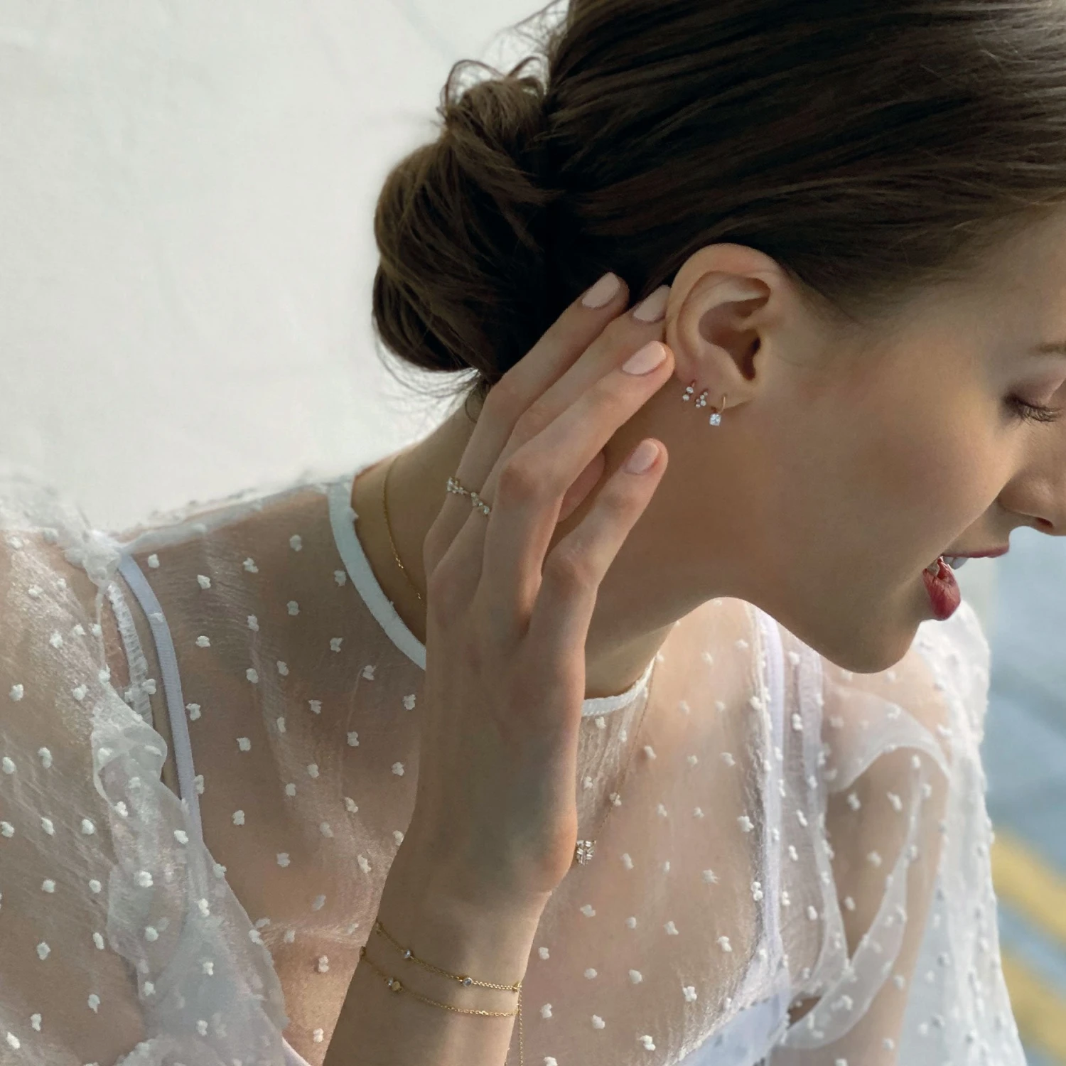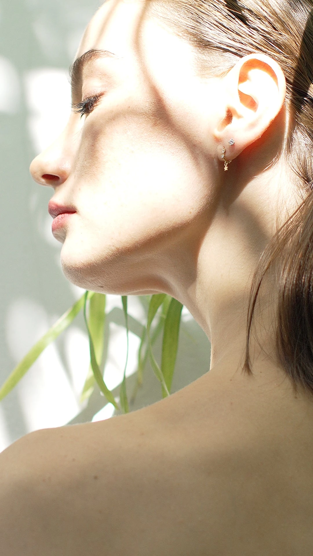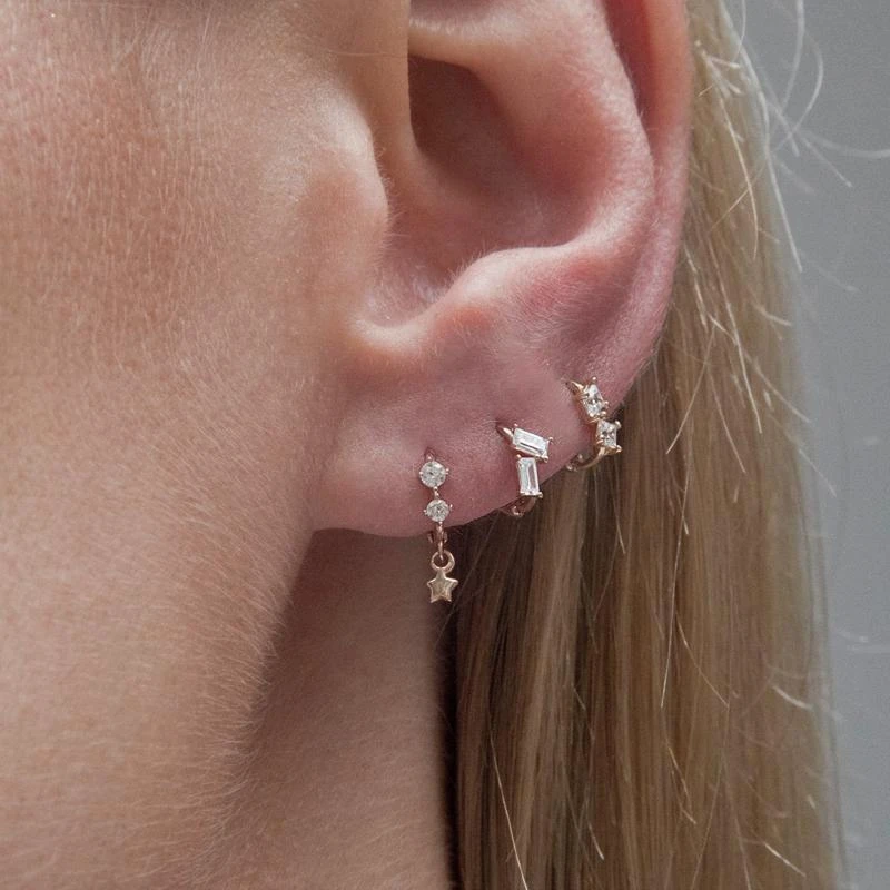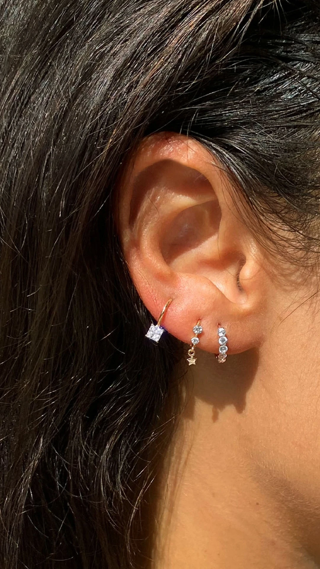 Good things come in tiny packages. A miniature sized hoop earring crafted in solid 9K yellow gold. A mini star dangles from a dainty hoop dotted with round brilliant stones. Best worn on a second or third lobe piercing, pair with tiny studs or a threader for a personalised touch. Approximately 8mm diameter.