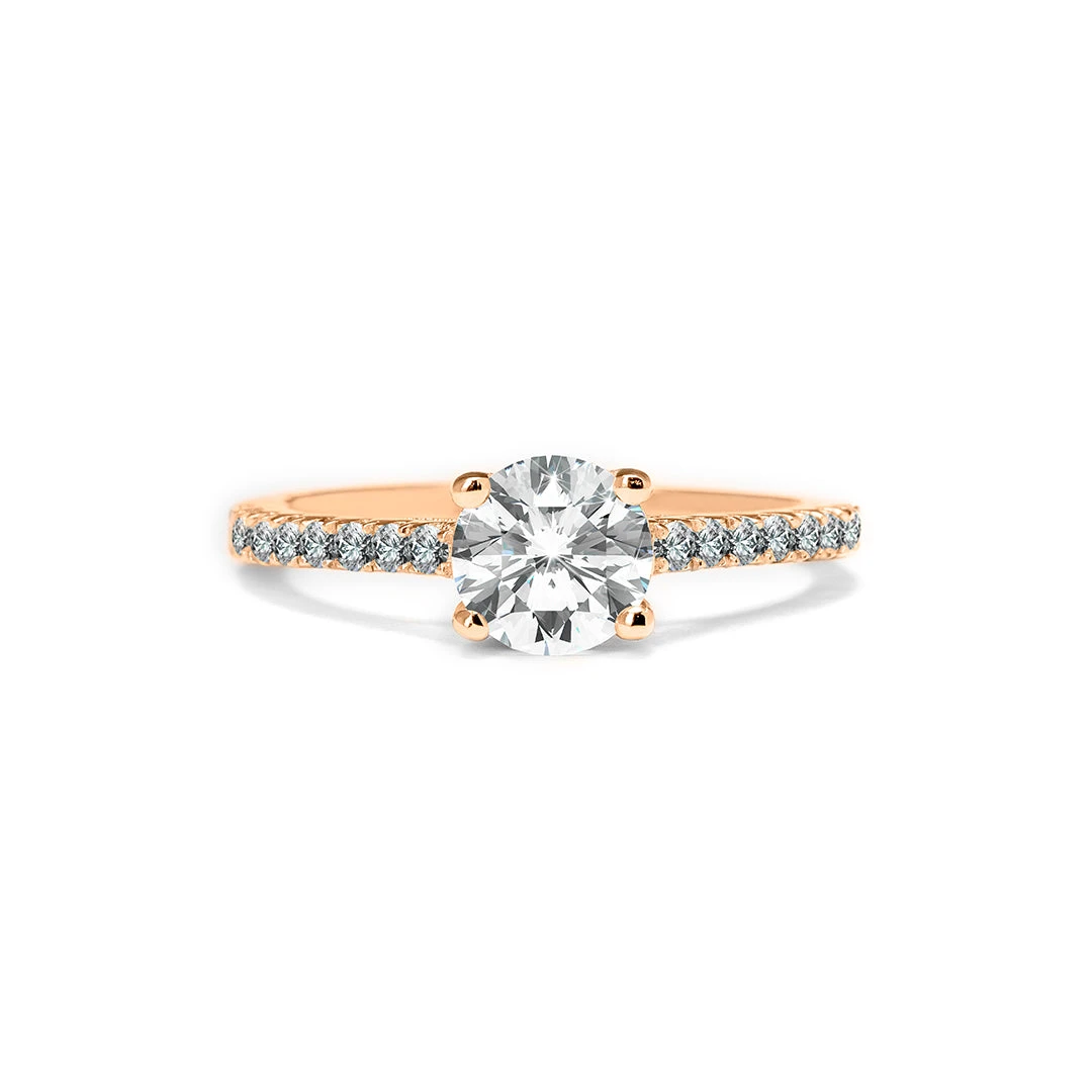 The Parker ring is a classic solitaire ring featuring a round brilliant diamond in a timeless 4-prong setting. Set in 18K gold, the band is further enhanced by a row of micro diamonds for added allure. Let this ring be the one to win her heart.
