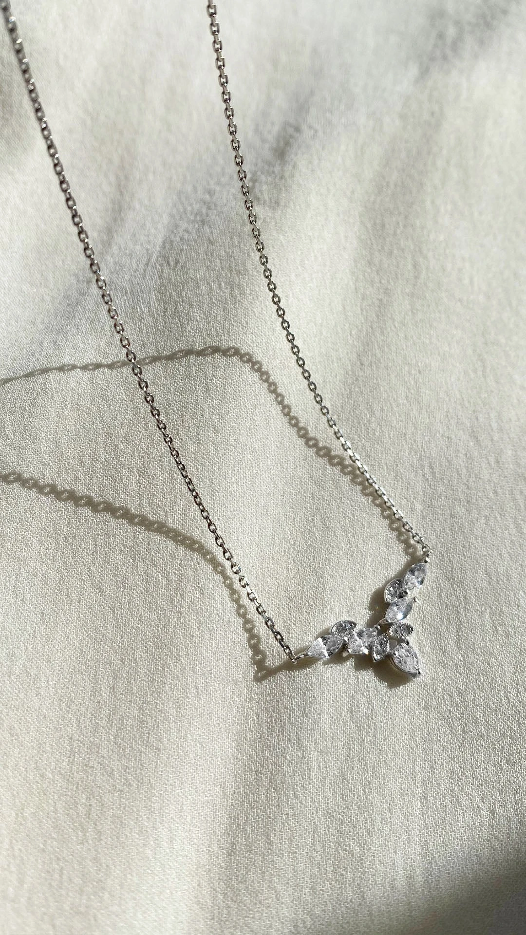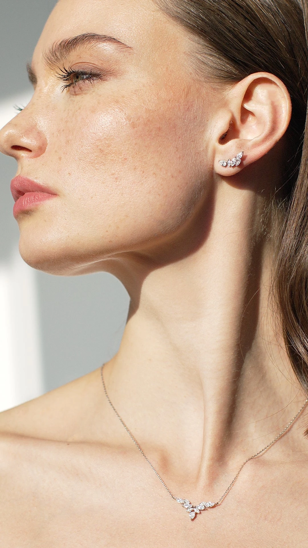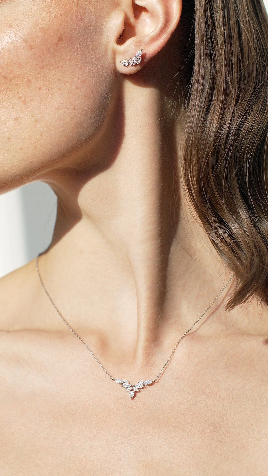 The Petal necklace features beautiful marquise and pear GENTLE DIAMONDS. All set in 9K white gold. This very flattering necklace, with an adjustable length chain of up to 45cm, can be paired with the Petal ring and Petunia earrings to complete your look.