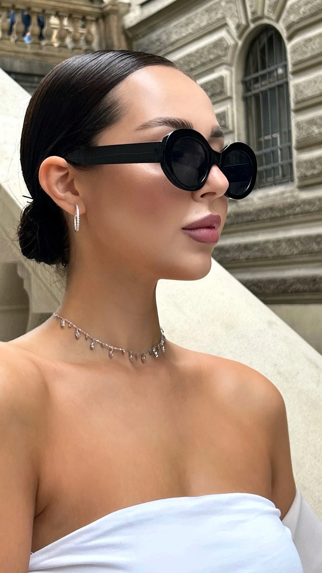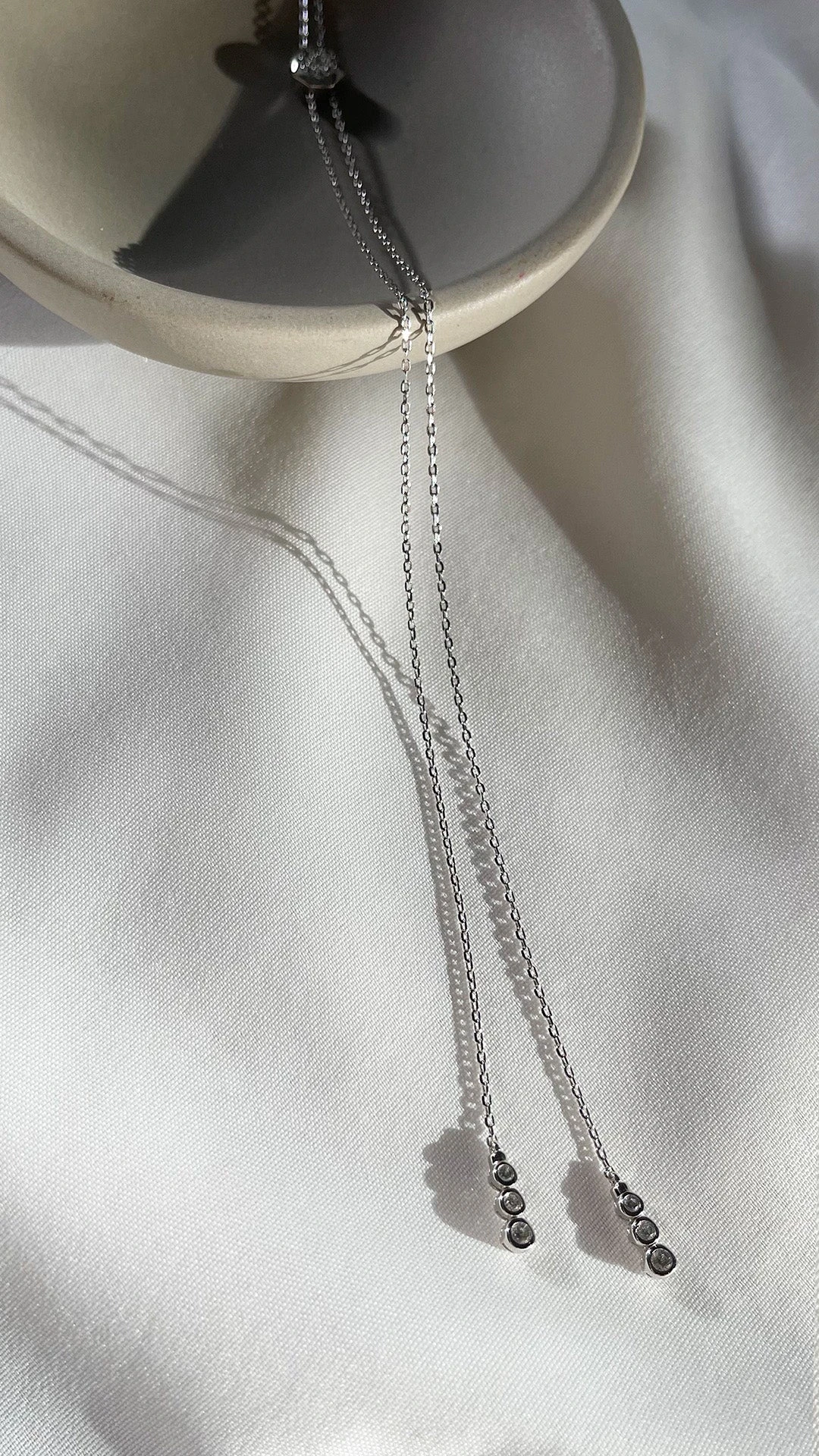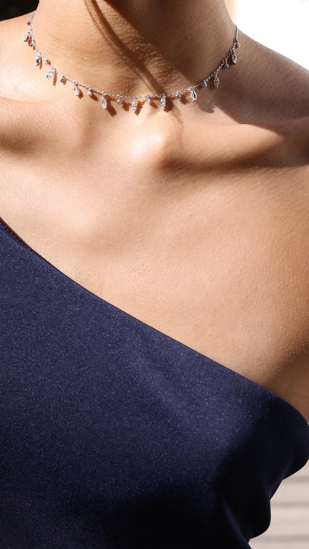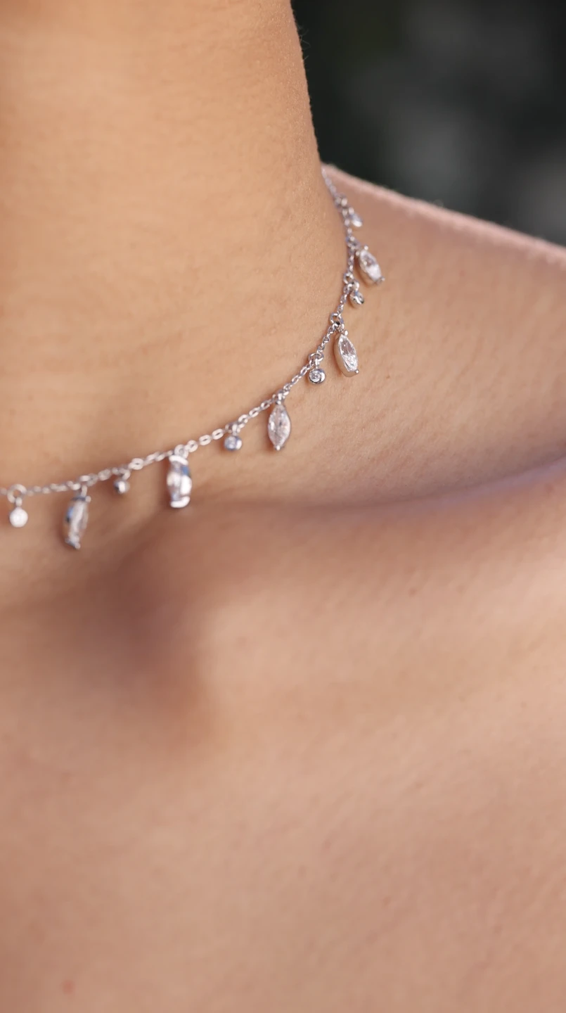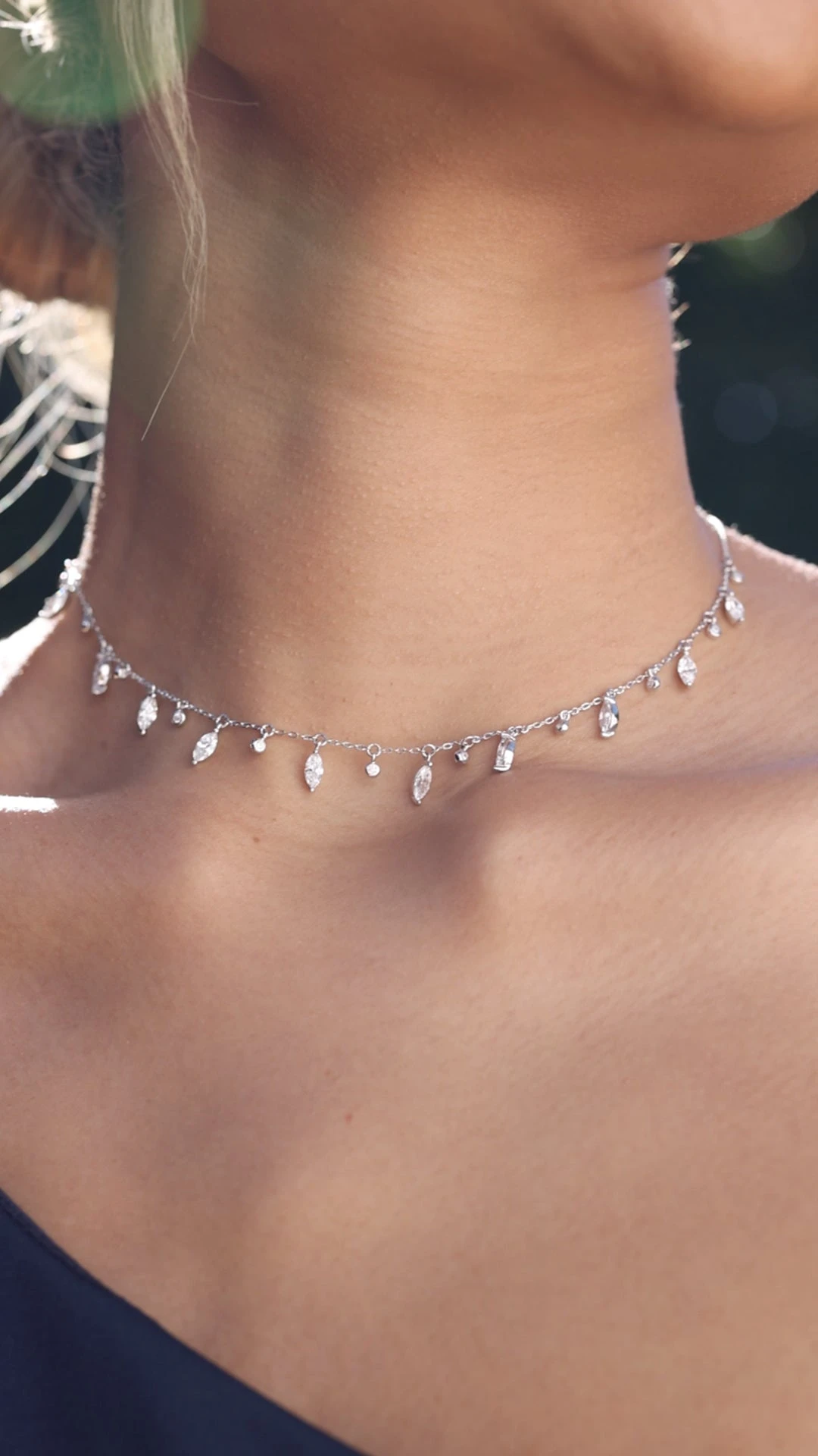 A stunning delicate necklace comprised of alternating marquise and round brilliant stones. Wear above the collarbones in a choker style. Complete with a slider closure for a fully adjustable fit.