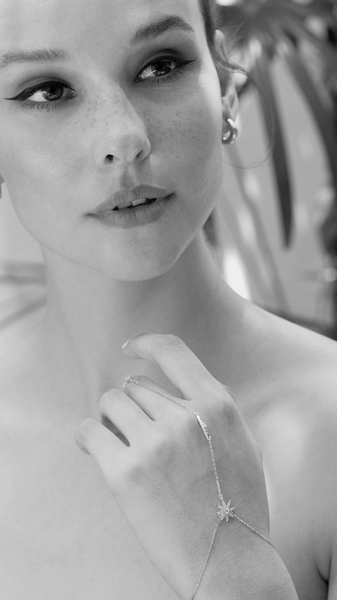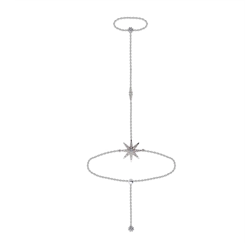 This delicate hand bracelet features our iconic star motif. It comes with a fine chain adjuster for a comfortable fit. Slip on this sexy piece for a unique and elegant touch.