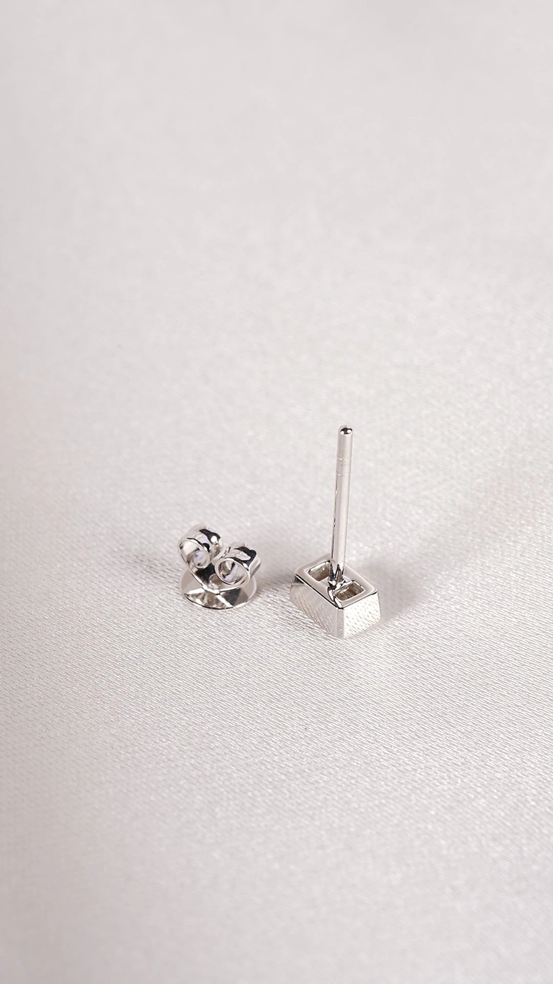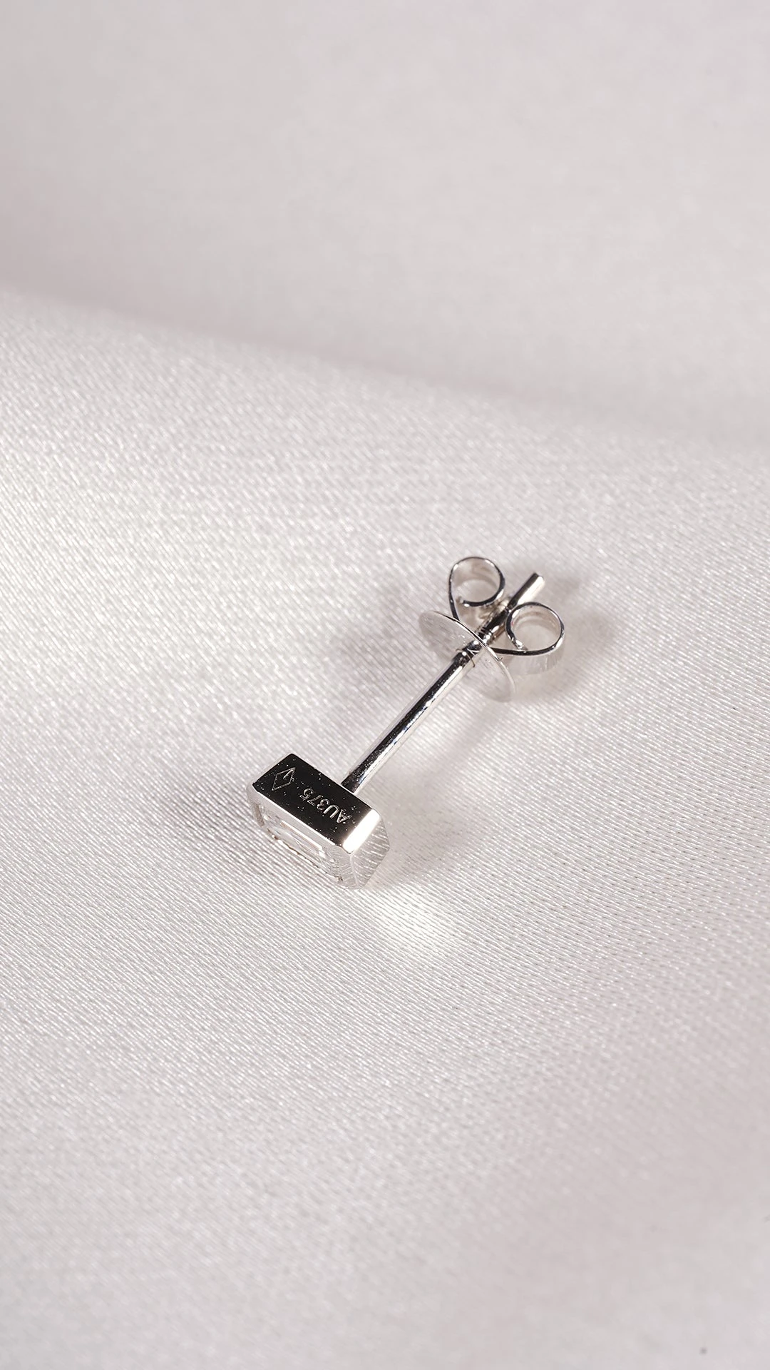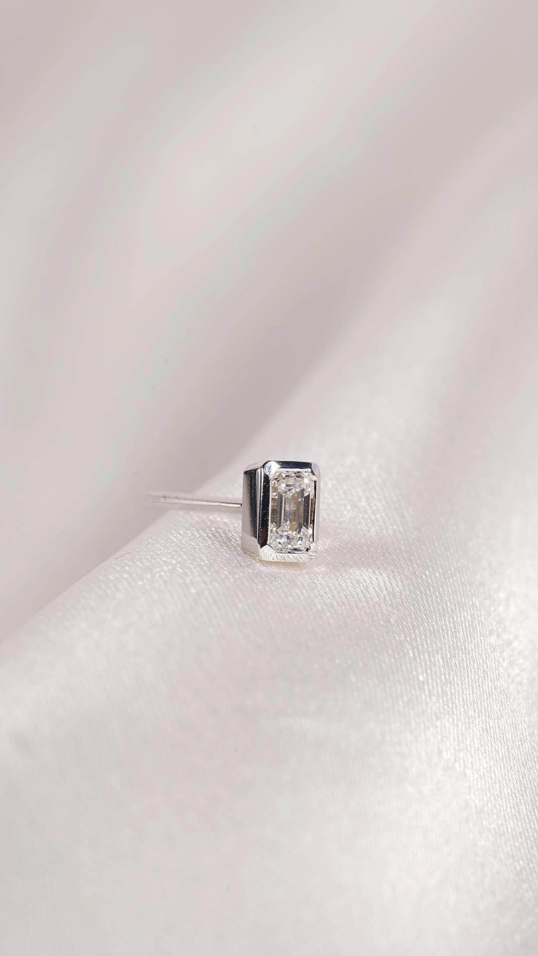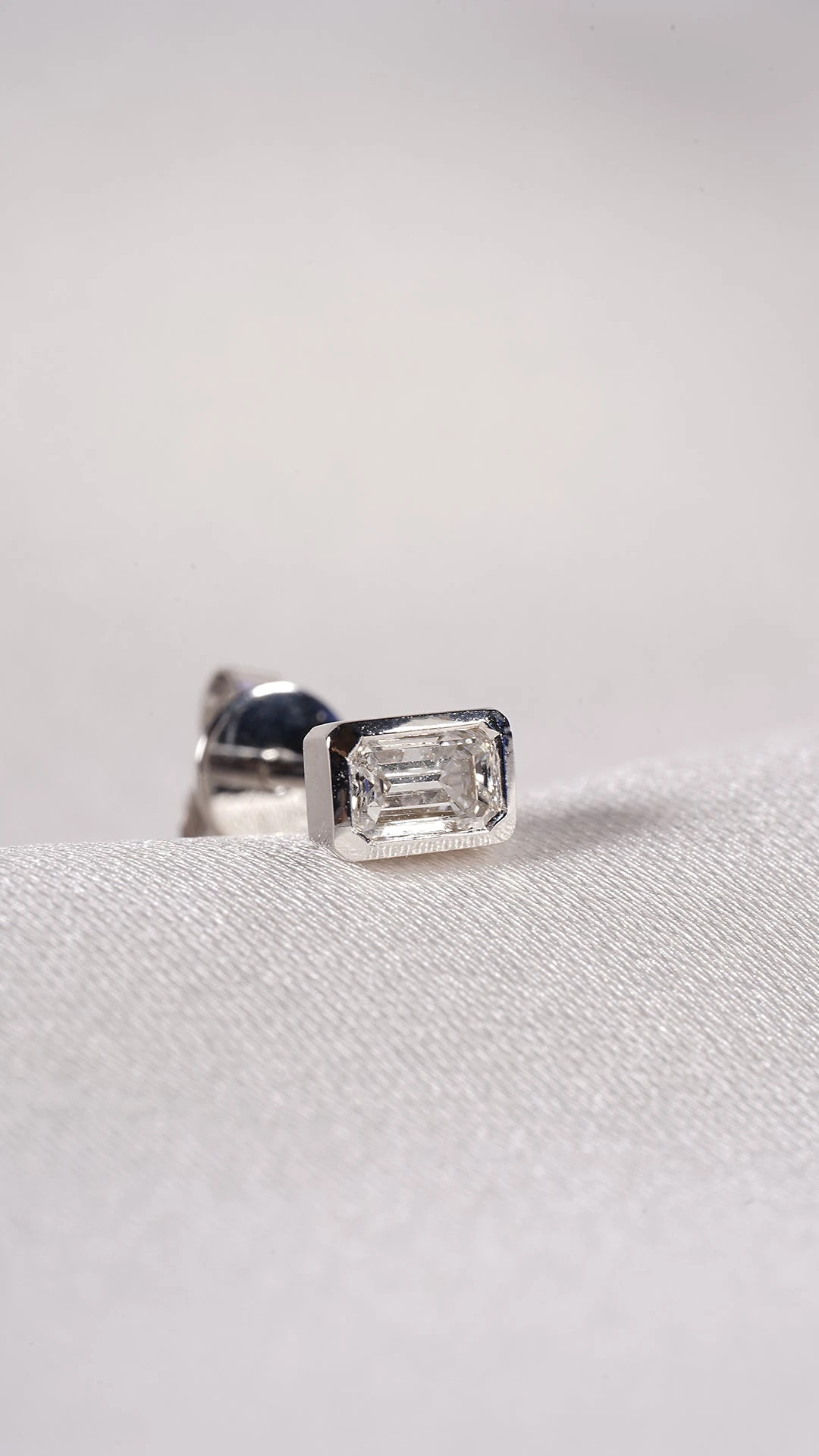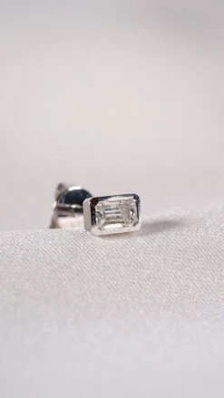 A simple bezel-set emerald cut stud set in 9K white gold.