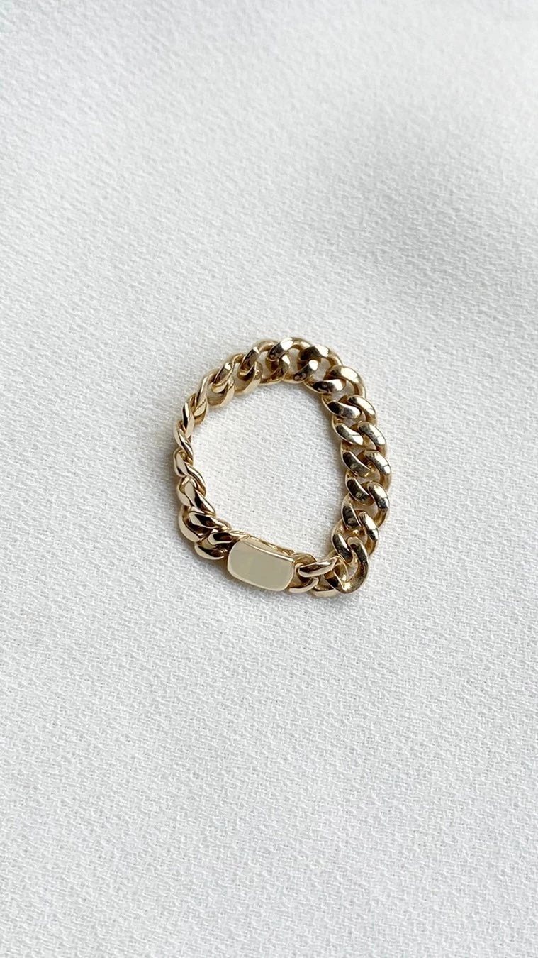 This chain ring is the perfect everyday piece to add to your everyday rotation. Handcrafted in 9K yellow gold, it is comprised of flat baby cuban links joined by a tiny plate.