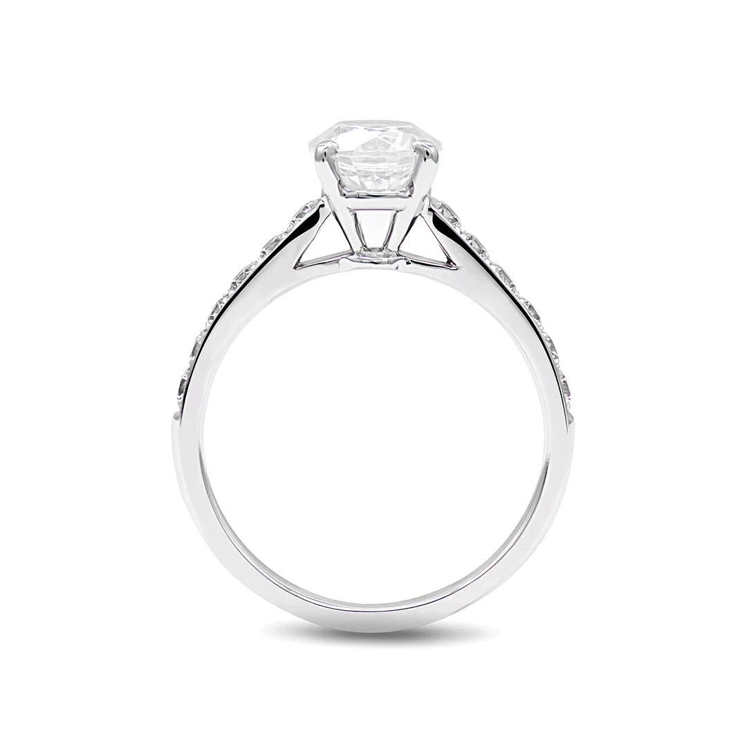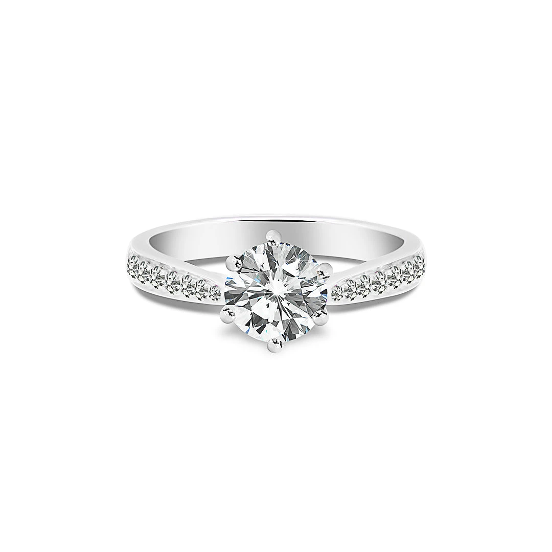 This ring is comprised of a stunning round brilliant diamond that sparkles from every angle, enhanced further by diamond microsettings on the band. Handcrafted in a secure six prong setting and placed on a polished 18K white gold band. Let this be the ring she will cherish forever.
