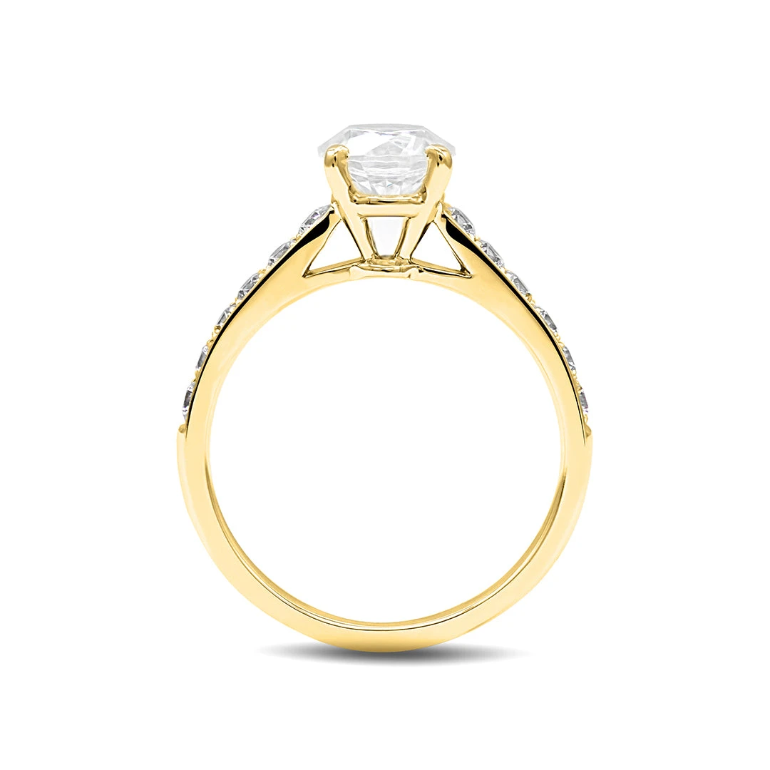 This ring is comprised of a stunning round brilliant diamond that sparkles from every angle, enhanced further by diamond microsettings on the band. Handcrafted in a secure six prong setting and placed on a polished 18K yellow gold band. Let this be the ring she will cherish forever.