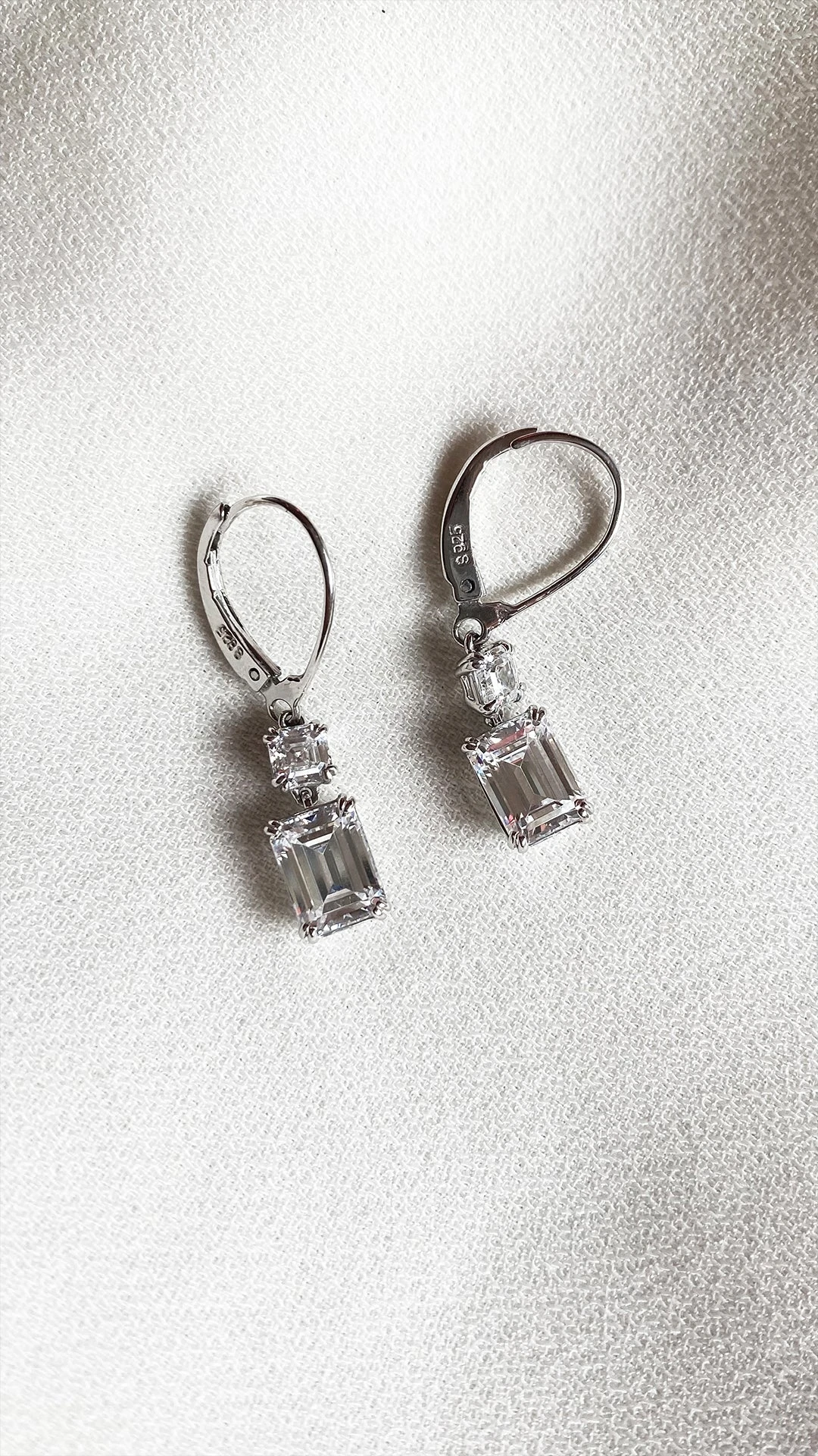 This classic pair features 1.5 carat equivalent Emerald cut as a main on our secure leaver back system. Wear it as your everyday staple with a total drop of 3 cm when worn.