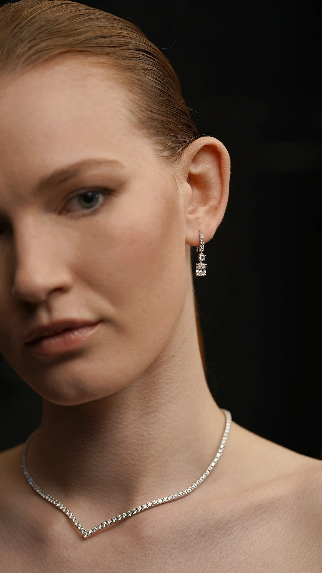 A beautiful staple pair of drop earrings featuring stunning oval cuts accented with tapered round brilliant stones. Finished with an elegant shepherd’s hook for easy wear. Pair with our bestselling tennis bracelets and a timeless pendant in your cut of choice.
