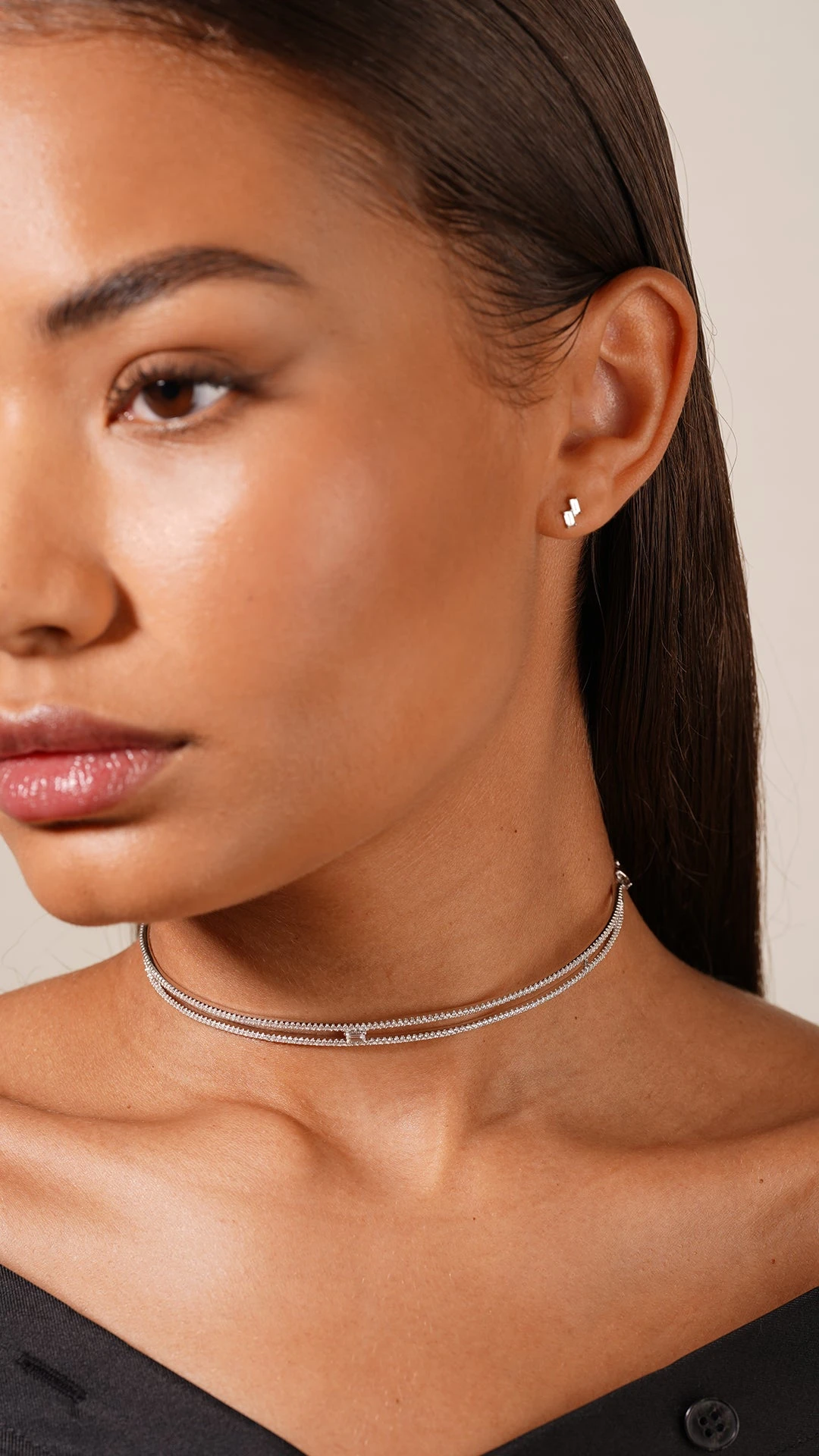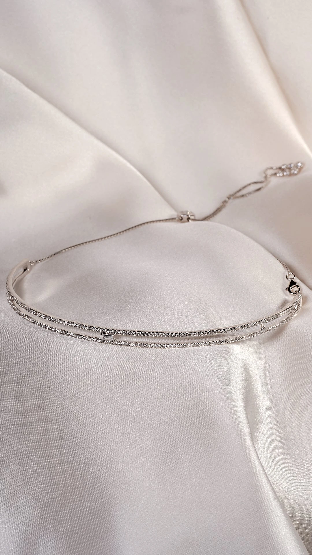 The Thela is designed to make an impression. An adjustable tension toggle holds this stunning necklace in place for a modern bridal look or an evening out.