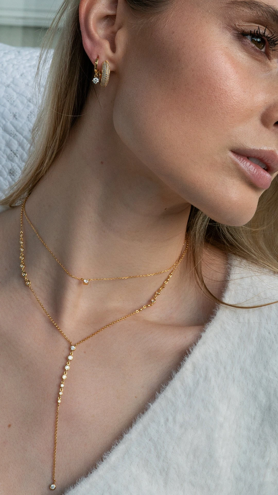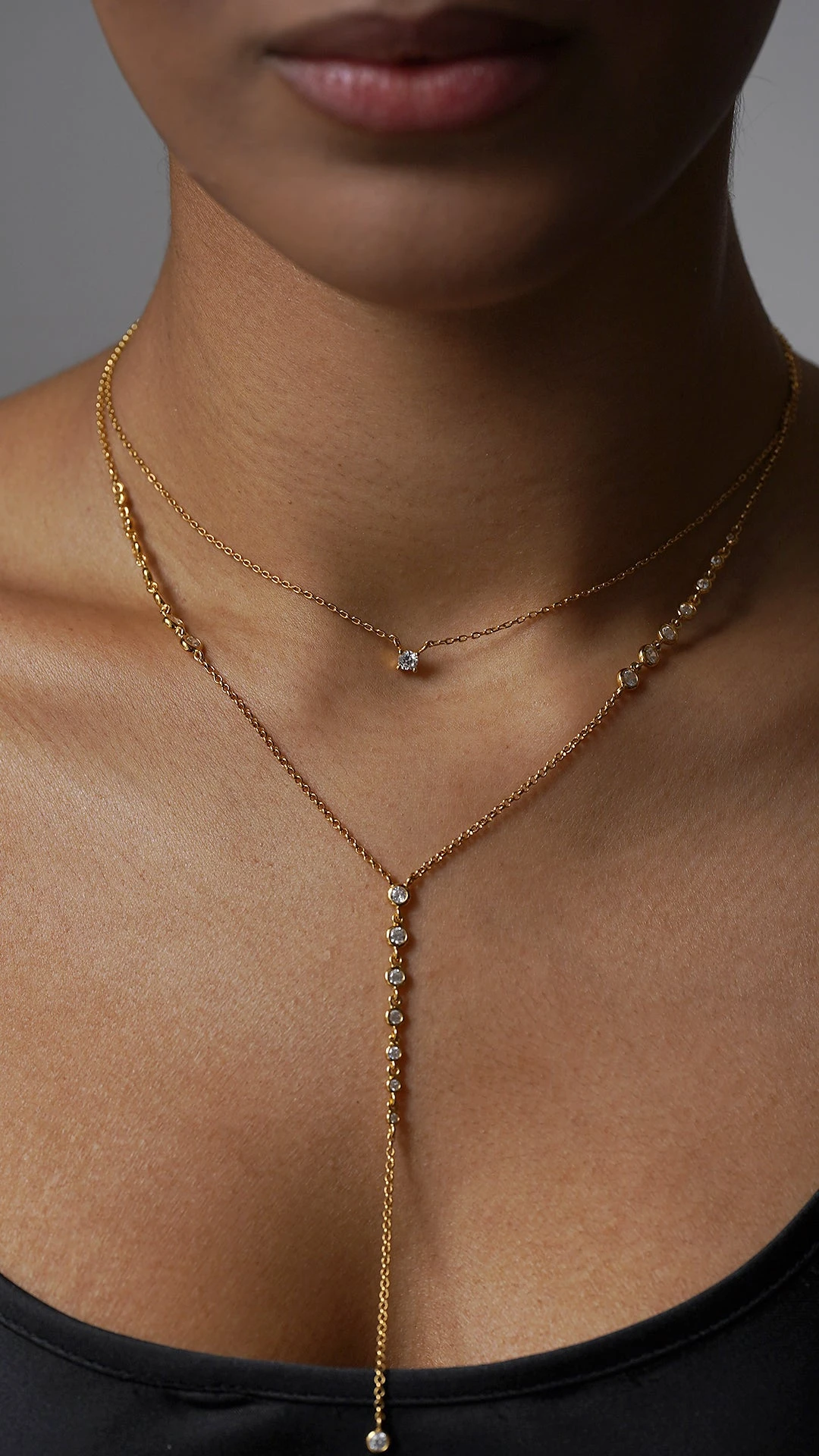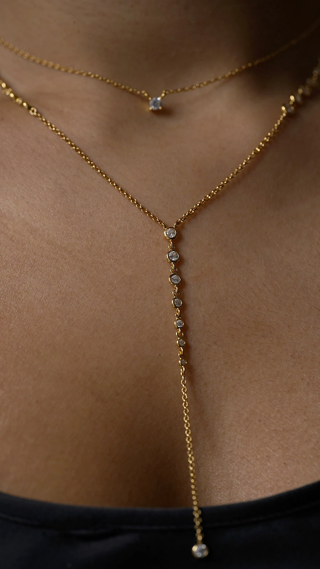A stunning all-in-one layered yellow gold vermeil necklace featuring round brilliant cut stones of an adjustable length.