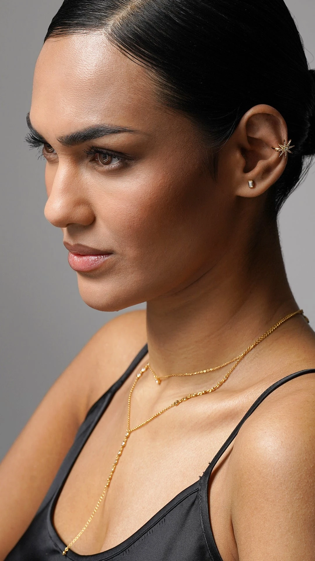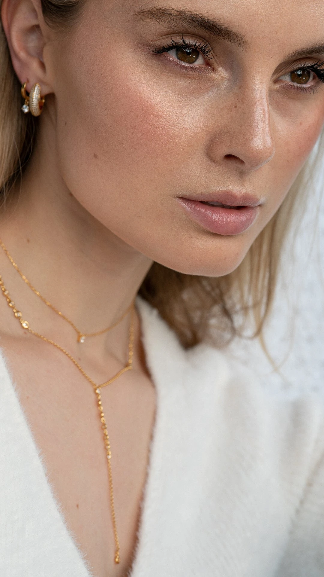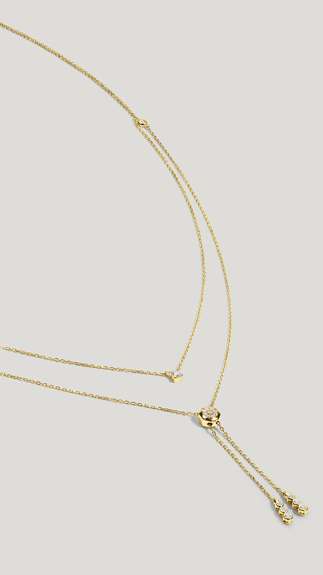 A stunning all-in-one layered yellow gold vermeil necklace featuring round brilliant cut stones of an adjustable length.