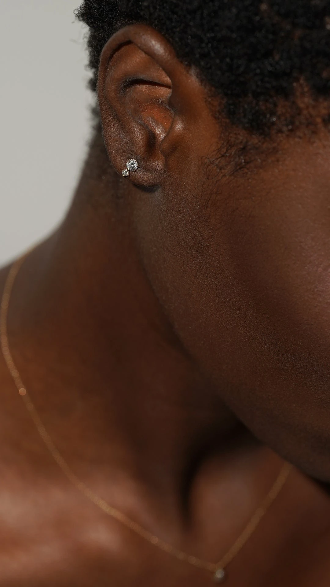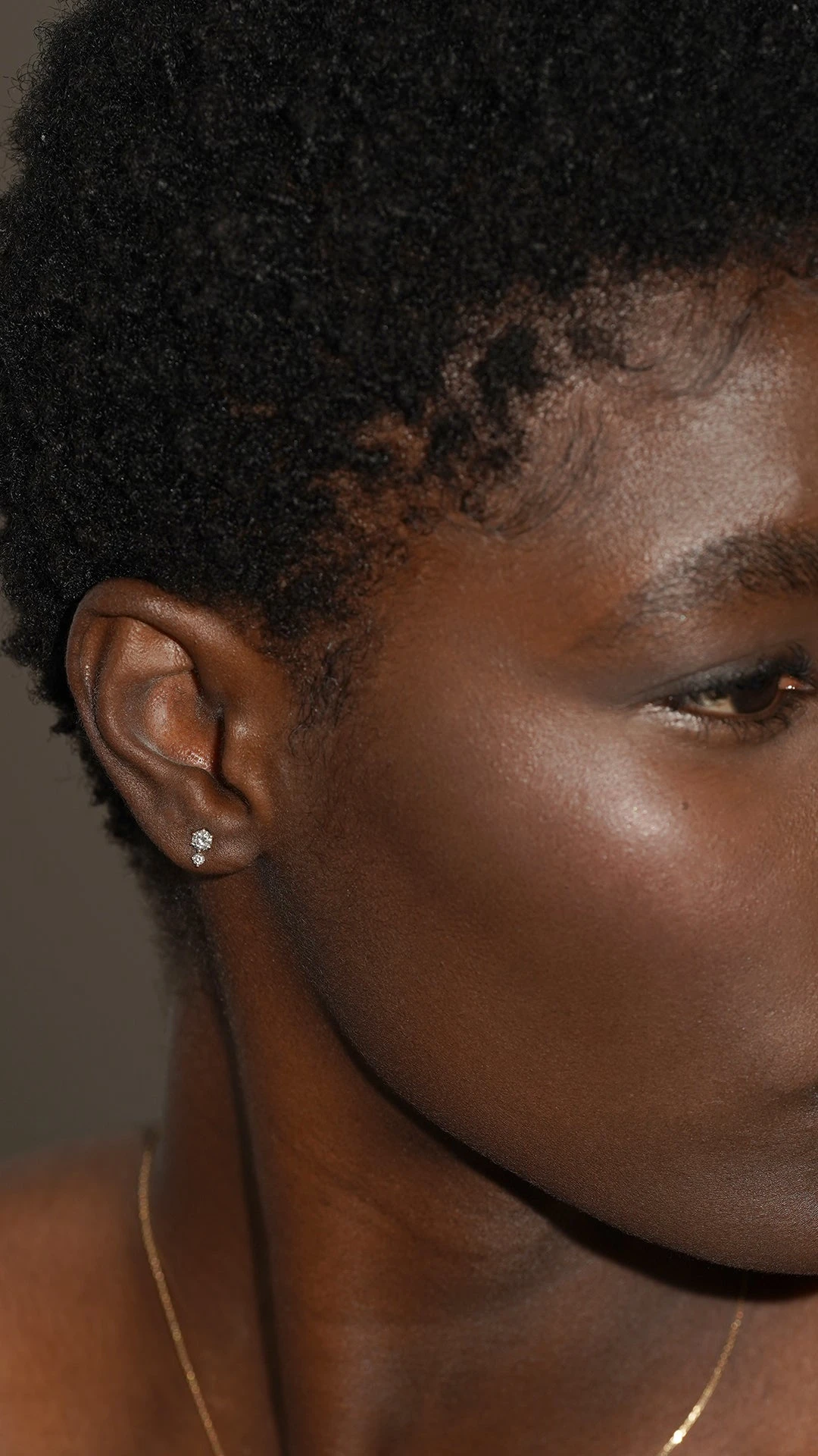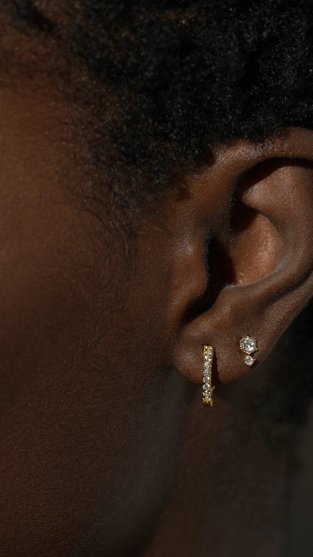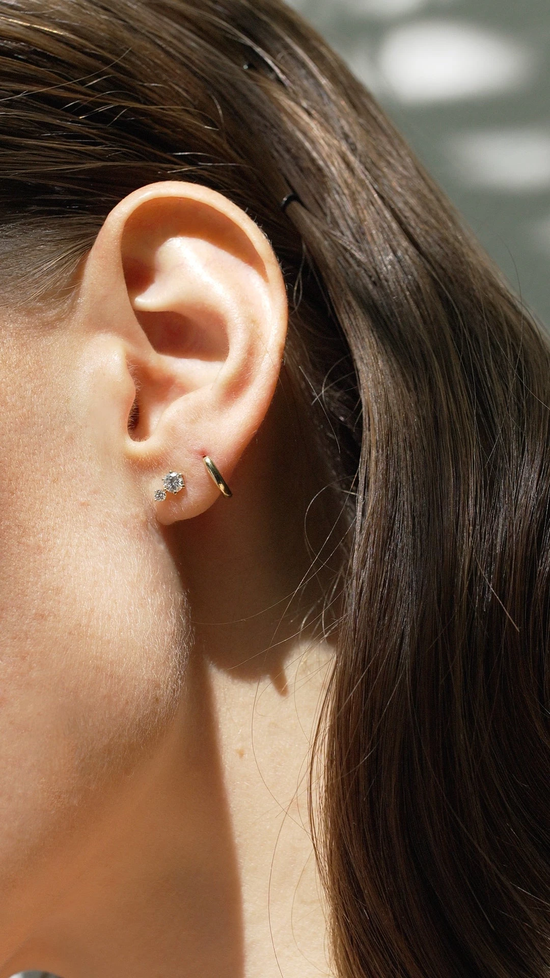 Good things come in tiny packages. A miniature-sized double diamond stud earring handcrafted in solid 9K yellow gold. Wear this cute asymmetric stud as an effortless update to your ear stack. Create your own earring combos and team with other tiny studs on your lobes.