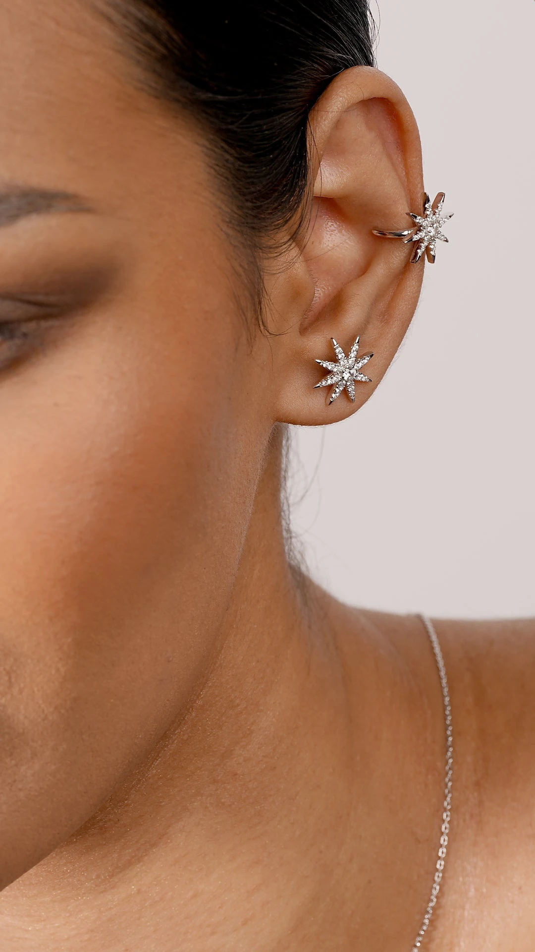 These studs are the perfect everyday staple piece. They are crafted in Sterling Silver and feature our intricately cut Round Brilliant and micro-set stones. To complete the look, team them with our Atrias Necklace and Vega Huggie from the same collection.