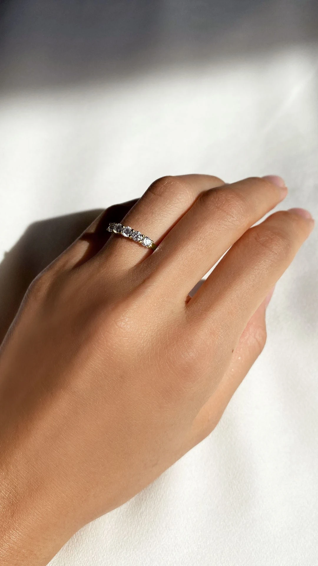 There’s nothing more classic than an eternity band. The Wendy ring comprises a single row of 5 GENTLE DIAMONDS set on a narrow polished band made of 18K yellow gold. Designed as the perfect complement to our engagement rings, this delicate diamond wedding band can be worn as a stackable ring or a completion to a set.