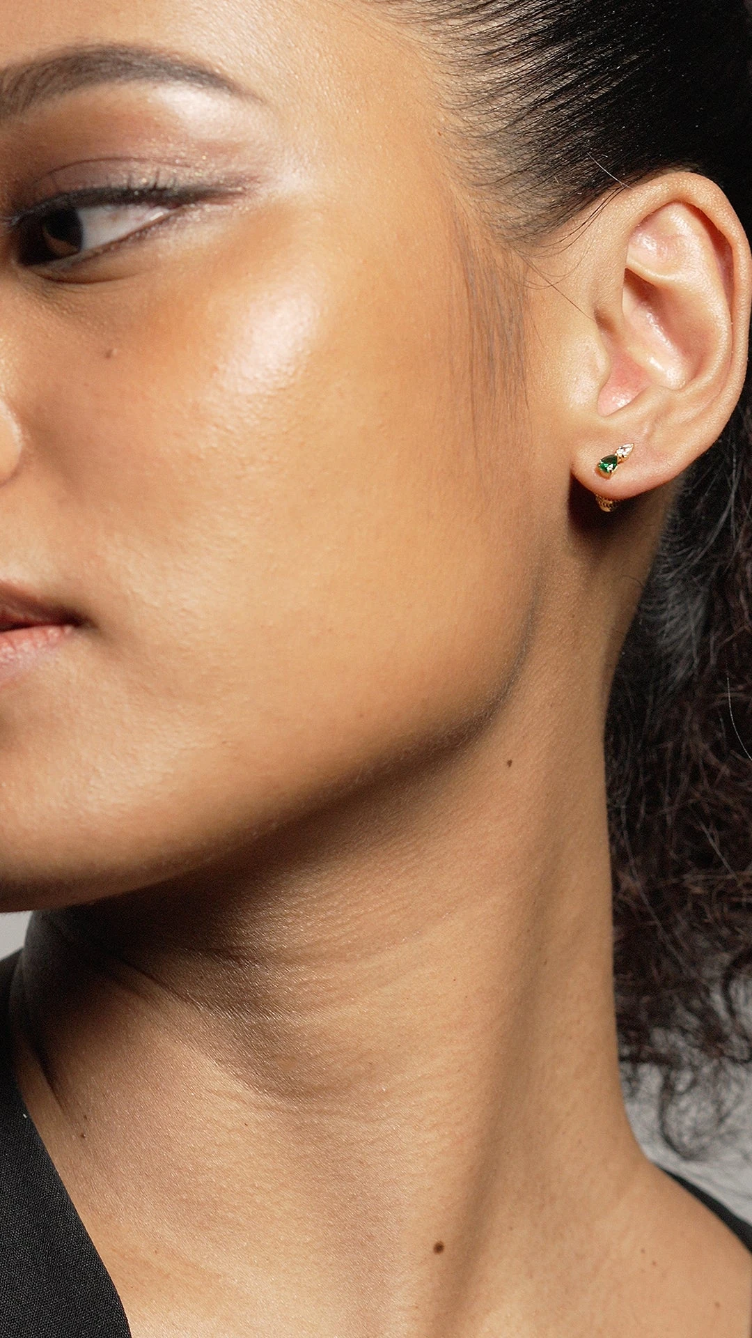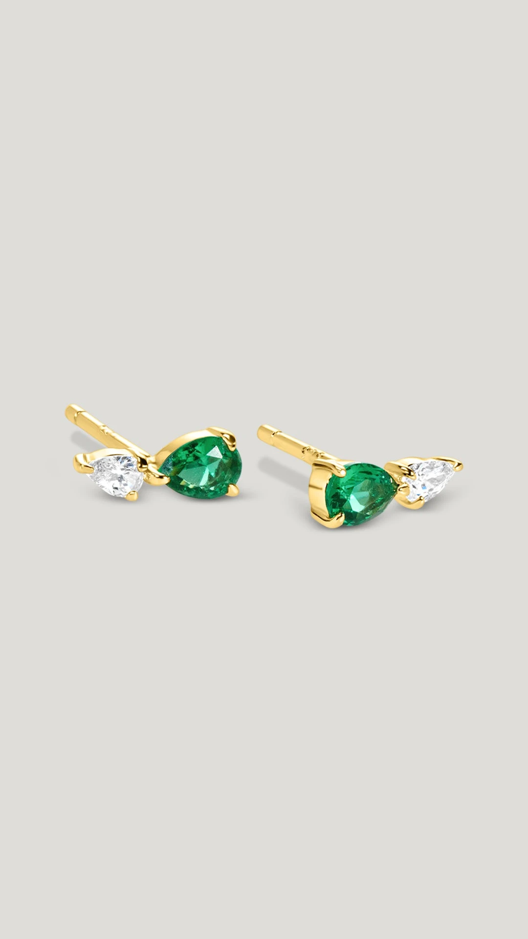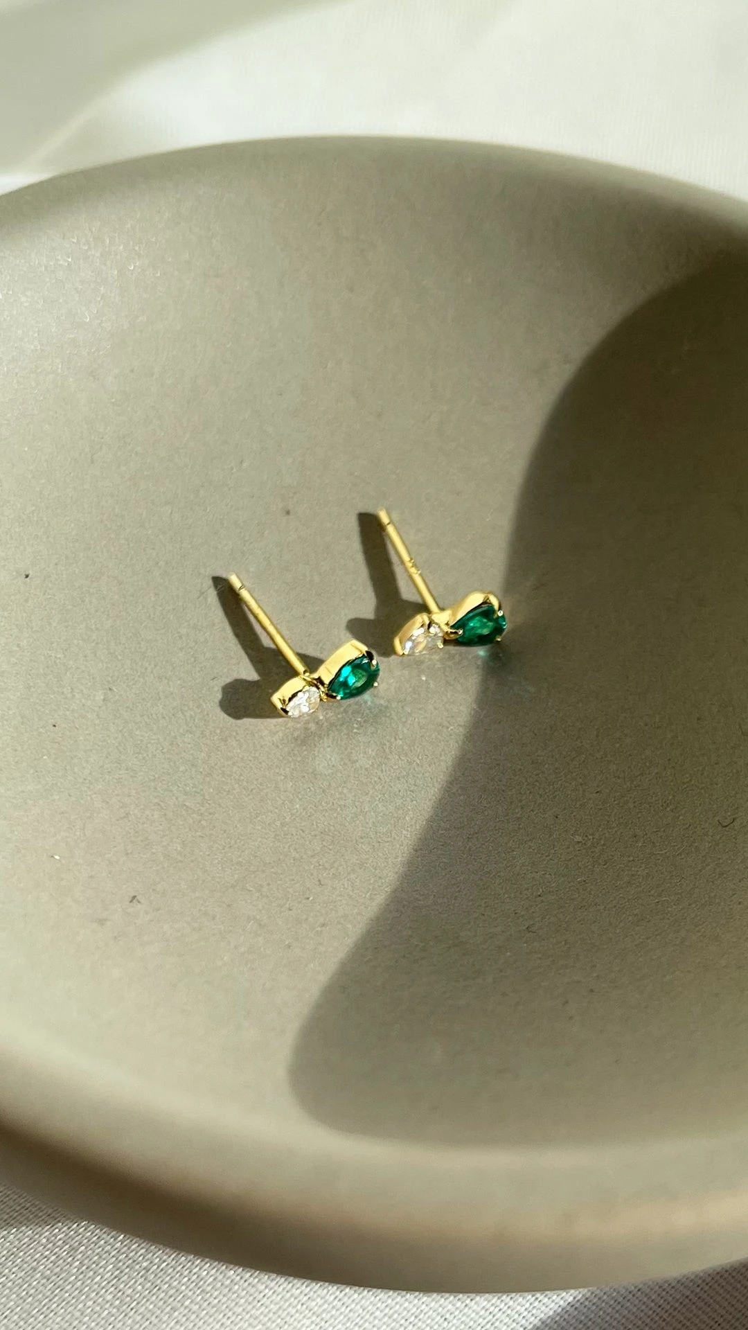 The Zeta studs are cute, everyday two-tone pear-cut studs in gold vermeil and emerald green, for something trendy and slightly different.