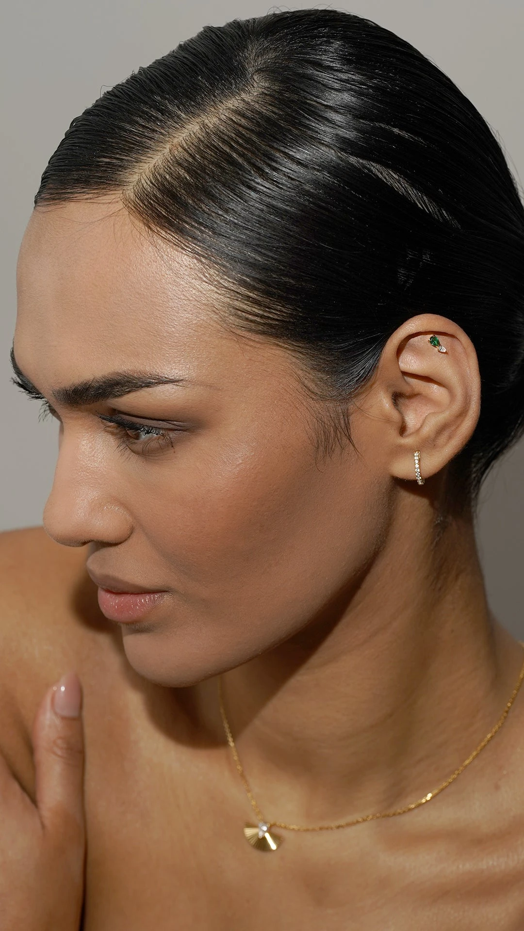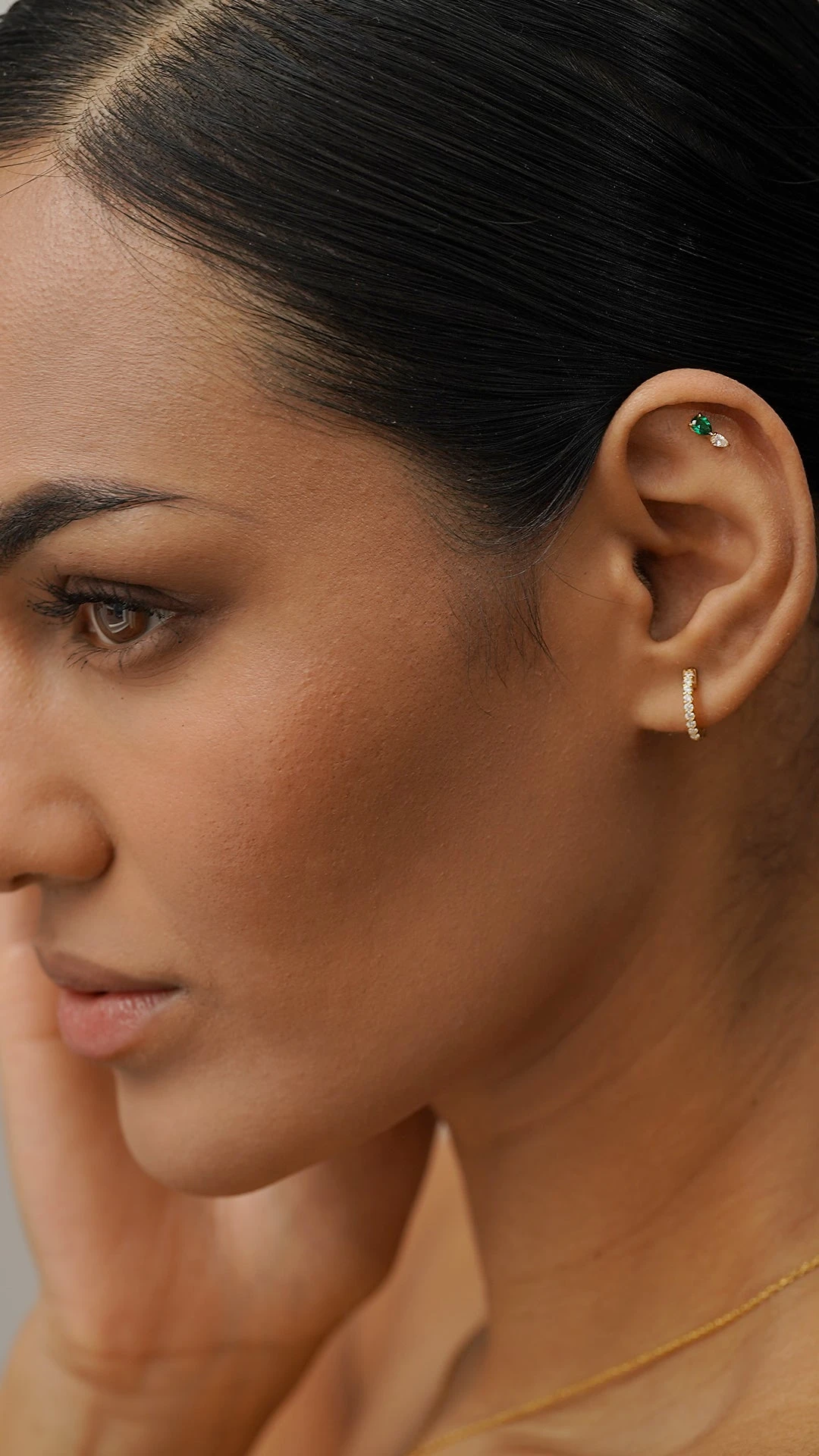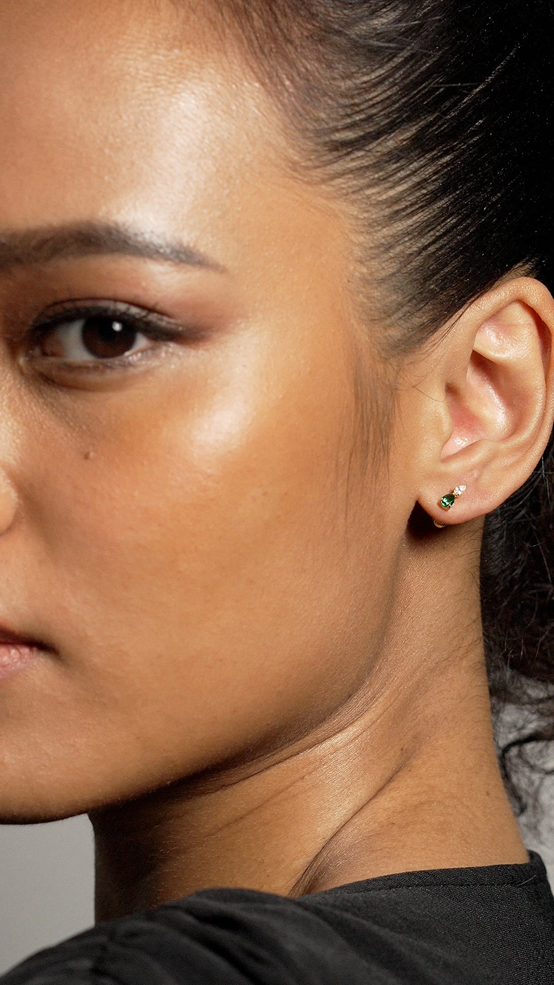 The Zeta studs are cute, everyday two-tone pear-cut studs in gold vermeil and emerald green, for something trendy and slightly different.
